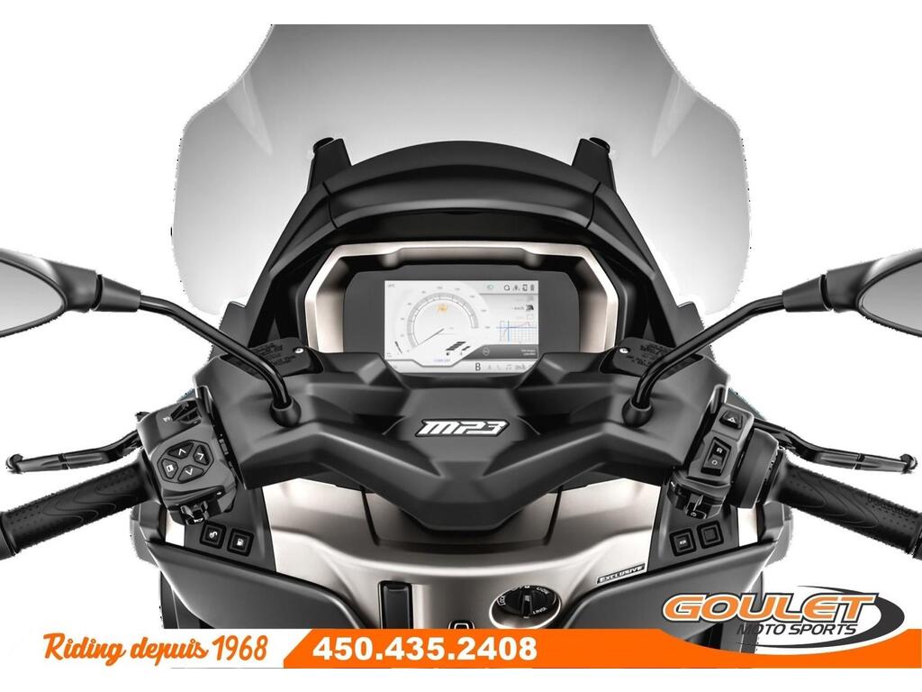 SCOOTER 3 ROUES PIAGGIO MP3 HPE EXCLUSIVE NERO METEORA   Le haut de gamme absolu dans tous les sens, le Piaggio MP3 530 hpe Exclusive est conçu pour les pilotes à la recherche du trois-roues le plus avancé du marché. Il continue d'élever la barre en termes de performances et de technologie, avec des fonctionnalités de style automobile telles que le régulateur de vitesse, la marche arrière, la caméra arrière et le BLIS (Blind Spot Information System). Inégalé en matière de deux et trois roues, c'est le scooter parfait si vous êtes prêt à rouler vers l'avenir. Goulet Moto Sports est votre concessionnaire pour l'achat et le service du MP3.   • Nouveau moteur 530 HPE euro 5  • Système ABS/ASR avec freinage combiné  • Compartiment de rangement avec port USB  • Compartiment sous le siège spacieux, assez pour 2 casques intégraux  • Groupe d'éclairage LED  • Instrumentation TFT couleur 7"  • Système de stationnement sans béquille  • Système d'entrée sans clé  • Régulateur de vitesse  • 3 mode de conduite (éco/sport/confort)  • Télécommande d'ouverture de selle avec recherche moto  • Marche arrière avec caméra de recul  • Système radar pour caractéristiques BLIS (Blind Spot Information System) et LCDAS  • Système de connectivité Bluetooth Piaggio MIA   \*\*\* FRAIS DE TRANSPORT ET PRÉPARATION INCLUS DANS LE PRIX \*\*\*   Cette unité est chez Goulet Moto Sports de Ste-Thérèse. Téléphonez au 450.435.2408   Possibilité de financement avec plusieurs institutions financières. 2ième chance au crédit disponible.   Goulet Moto Sports est votre concessionnaire moto depuis 1968. Fier représentant officiel des marques HONDA, APRILIA, MOTO GUZZI, VESPA, PIAGGIO, KTM, NIU, SURRON et URAL pour le grand Montréal. Nous avons un énorme choix de moto usagés inspectées par nos professionnels. 2 adresses pour vous servir, soit à Sainte-Thérèse (450.435.2408) et Saint-Jérôme (450.431.6622).   Goulet Moto Sports ne peut être tenu responsable d'une omission, d'un délai ou d'une erreur de transcription de l'information. Le prix affiché reflète la condition de l'unité. Pour différentes raisons les prix peuvent différer de ceux indiqués en ligne. Les données sont affichées à titre indicatif seulement et ne peuvent être considérées comme une information contractuelle. Nous vous encourageons vivement à nous consulter pour plus de détails avant de vous déplacer. Des frais tels que taxes, immatriculation, administrations ou autres peuvent s'appliquer.  Essence, Transmission: CVT, Système de refroidissement: Refroidi au liquide, 1 cylindres, 530.0 CC, Garantie: 2 ans  ----------------------  PIAGGIO MP3 HPE EXCLUSIVE 3 WHEEL SCOOTER NERO METEORA   The absolute top of the range in every way, the Piaggio MP3 530 hpe Exclusive is designed for riders looking for the most advanced three-wheeler on the market. It continues to raise the bar in performance and technology, with automotive-style features such as cruise control, reverse gear, rear camera and BLIS (Blind Spot Information System). Unrivaled when it comes to two and three wheels, it's the perfect scooter if you're ready to roll into the future. Goulet Moto Sports is your dealer for MP3 purchase and service.   • New 530 HPE euro 5 engine  • ABS/ASR system with combined braking  • Storage compartment with USB port  • Spacious underseat compartment, enough for 2 full-face helmets  • LED lighting group  • 7" color TFT instrumentation  • Standless parking system  • Keyless entry system  • Speed ??regulator  • 3 driving modes (eco/sport/comfort)  • Seat opening remote control with motorcycle search  • Reverse gear with reversing camera  • Radar system for BLIS (Blind Spot Information System) and LCDAS characteristics  • Piaggio MIA Bluetooth connectivity system   \*\*\* SHIPPING AND PREPARATION INCLUDED IN THE PRICE \*\*\*   This unit is at Goulet Moto Sports in Ste-Thérèse. Call 450.435.2408   Possibility of financing with several financial institutions. 2nd chance credit available.   Goulet Moto Sports has been your motorcycle dealer since 1968. Proud official representative of the HONDA, APRILIA, MOTO GUZZI, VESPA, PIAGGIO, KTM, NIU, SURRON and URAL brands for greater Montreal. We have a huge selection of used motorcycles inspected by our professionals. 2 addresses to serve you, in Sainte-Thérèse (450.435.2408) and Saint-Jérôme (450.431.6622).   Goulet Moto Sports cannot be held responsible for any omission, delay or transcription error in the information. The displayed price reflects the condition of the unit. For various reasons the prices may differ from those indicated online. The data is displayed for information purposes only and cannot be considered as contractual information. We strongly encourage you to consult us for more details before you travel. Charges such as taxes, registration, administration or others may apply.  Gasoline, Transmission: CVT, Cooling System: Liquid cooling, 1 cylinders, 530.0 CC, Warranty: 2 ans