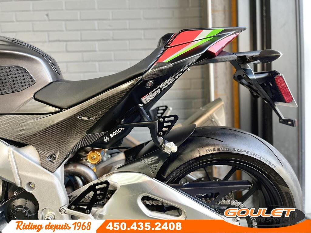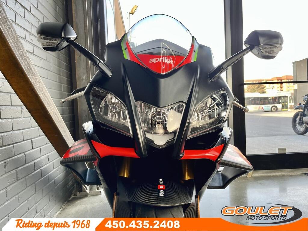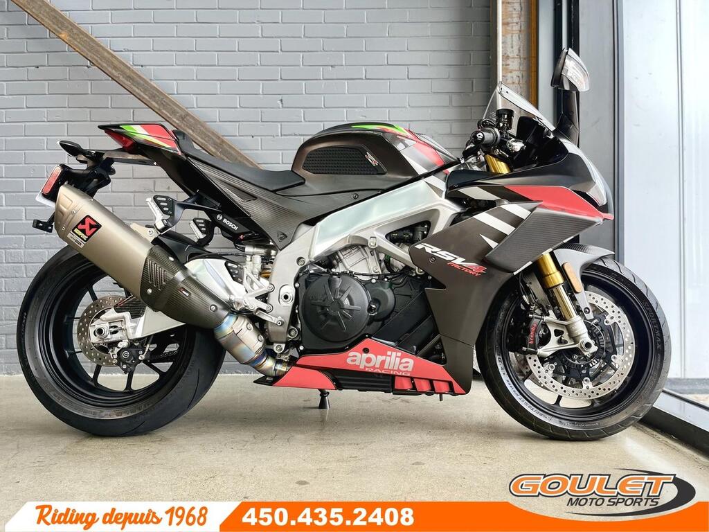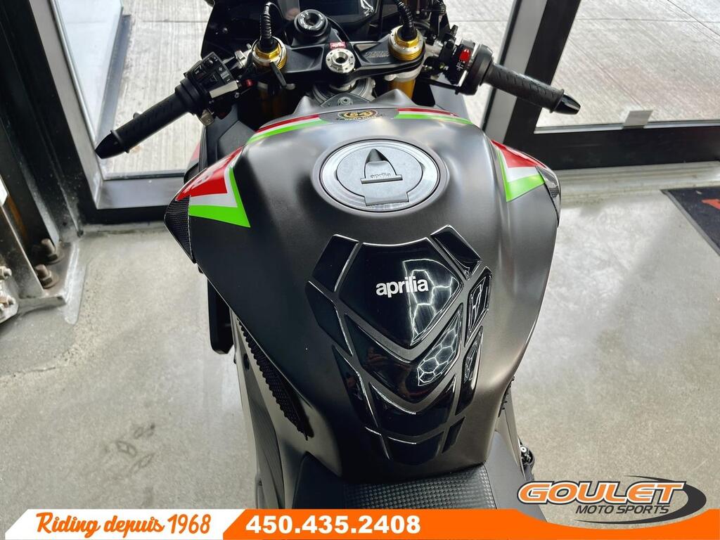 APRILIA RSV4 1100 FACTORY   \*\*\* Moto impeccable et bien équipé - avec Akrapovic - PRIX RÉDUIT À 18499$ \*\*\*   La version Factory de la RSV4 était unique en 2020 avec sa couleur spéciale Atomic Racing, les Winglets aérodynamique, les pièces de carbone, la suspension Ohlins Active, les roues forgées et surtout l'échapement Akrapovic par Aprilia. Cette version 1100 de la RSV4 développe 217hp et est d'une efficacité redoutable.   - Slip-On Akrapovic by Aprilia en Titane et légal pour la route  - Aile avant, Side cover, Aerodynamic Winglet, partie avant du réservoir en carbone.  - Protège feiring, swingarm et réservoir en carbone, protège réservoir.  - Moteur V4 de 1077cc devellopant 217hp  - Suspension Électronique Semi-Active Smart EC2.0 par Ohlins  - Roues forgées pour un poid réduit  - Freins Brembo Stylema avec Cornering ABS  - 3 modes de conduite, Traction Control ajustable en route (8 modes), Wheelie Control (3 modes), Launch mode, ABS ajustable  - Quickshift Up&Down, régulateur de vitesse (Cruise Control)  - Écran couleur TFT, Bluetooth ready.   Cette unité est chez Goulet Moto Sports de Ste-Thérèse. Téléphonez au 450.435.2408   Possibilité de financement avec plusieurs institutions financières. 2ième chance au crédit disponible.   Goulet Moto Sports est votre concessionnaire moto depuis 1968. Fier représentant officiel des marques HONDA, APRILIA, MOTO GUZZI, VESPA, PIAGGIO, KTM, NIU, SURRON et URAL pour le grand Montréal. Nous avons un énorme choix de moto usagés inspectées par nos professionnels. 2 adresses pour vous servir, soit à Sainte-Thérèse (450.435.2408) et Saint-Jérôme (450.431.6622).   Goulet Moto Sports ne peut être tenu responsable d'une omission, d'un délai ou d'une erreur de transcription de l'information. Le prix affiché reflète la condition de l'unité. Pour différentes raisons les prix peuvent différer de ceux indiqués en ligne. Les données sont affichées à titre indicatif seulement et ne peuvent être considérées comme une information contractuelle. Nous vous encourageons vivement à nous consulter pour plus de détails avant de vous déplacer. Des frais tels que taxes, immatriculation, administrations ou autres peuvent s'appliquer.   Comparable à une Ducati Panigale, BMW S1000RR, Honda CBR 1000RR-R, Suzuki GSX 1000R, Yamaha R1  Essence, Transmission: Manuelle, 6 vitesses, Système de refroidissement: Refroidi au liquide, 4 cylindres, 217.0 CV, 1077.0 CC  ----------------------  APRILIA RSV4 1100 FACTORY   \*\*\* IMPECCABLE AND EQUIPPED MOTORCYCLE \*\*\*   Equipment specific to this Aprilia RSV4 Factory:  - Akrapovic by Aprilia Slip-On in Titanium and legal for the road  - Front wing, Side cover, Aerodynamic Winglet, carbon front part of the tank.  - Protects feiring, swingarm and carbon tank   The Factory version of the RSV4 was unique in 2020 with its special Atomic Racing color, aerodynamic Winglets, carbon parts, Ohlins Active suspension, forged wheels and above all the Akrapovic exhaust by Aprilia. This 1100 version of the RSV4 develops 217hp and is extremely efficient.   - 1077cc V4 engine developing 217hp  - Smart EC2.0 Semi-Active Electronic Suspension by Ohlins  - Forged wheels for reduced weight  - Brembo Stylema brakes with Cornering ABS  - 3 driving modes, Traction Control adjustable on the road (8 modes), Wheelie Control (3 modes), Launch mode, adjustable ABS  - Quickshift Up&Down, cruise control (Cruise Control)  - TFT color screen, Bluetooth ready.   This unit is at Goulet Moto Sports in Ste-Thérèse. Call 450.435.2408   Possibility of financing with several financial institutions. 2nd chance credit available.   Goulet Moto Sports has been your motorcycle dealer since 1968. Proud official representative of the HONDA, APRILIA, MOTO GUZZI, VESPA, PIAGGIO, KTM, NIU, SURRON and URAL brands for greater Montreal. We have a huge selection of used motorcycles inspected by our professionals. 2 addresses to serve you, in Sainte-Thérèse (450.435.2408) and Saint-Jérôme (450.431.6622).   Goulet Moto Sports cannot be held responsible for any omission, delay or transcription error in the information. The displayed price reflects the condition of the unit. For various reasons the prices may differ from those indicated online. The data is displayed for information purposes only and cannot be considered as contractual information. We strongly encourage you to consult us for more details before you travel. Charges such as taxes, registration, administration or others may apply.   Comparable to a Ducati Panigale, BMW S1000RR, Honda CBR 1000RR, Suzuki GSX 1000R, Yamaha R1  Gasoline, Transmission: Manual, 6 speeds, Cooling System: Liquid cooling, 4 cylinders, 217.0 HP, 1077.0 CC