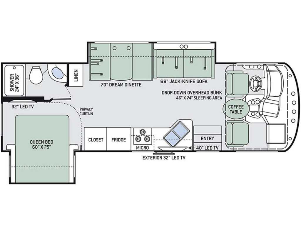 Options : Génératrice à essence, Réservoir de propane, Climatiseur conduit central, Miroirs électriques, Régulateur de vitesse, Volant inclinable, Caméra Marche arrière, Cric hydraulique, Douche extérieure, Échelle, Attache-remorque, Douche, Toilette, Lit queen-size, Prise électrique, Téléviseur, Antenne pour téléviseur, Micro-onde, Cuisinière, Four, Fourneau, Auvent, Chauffe-eau