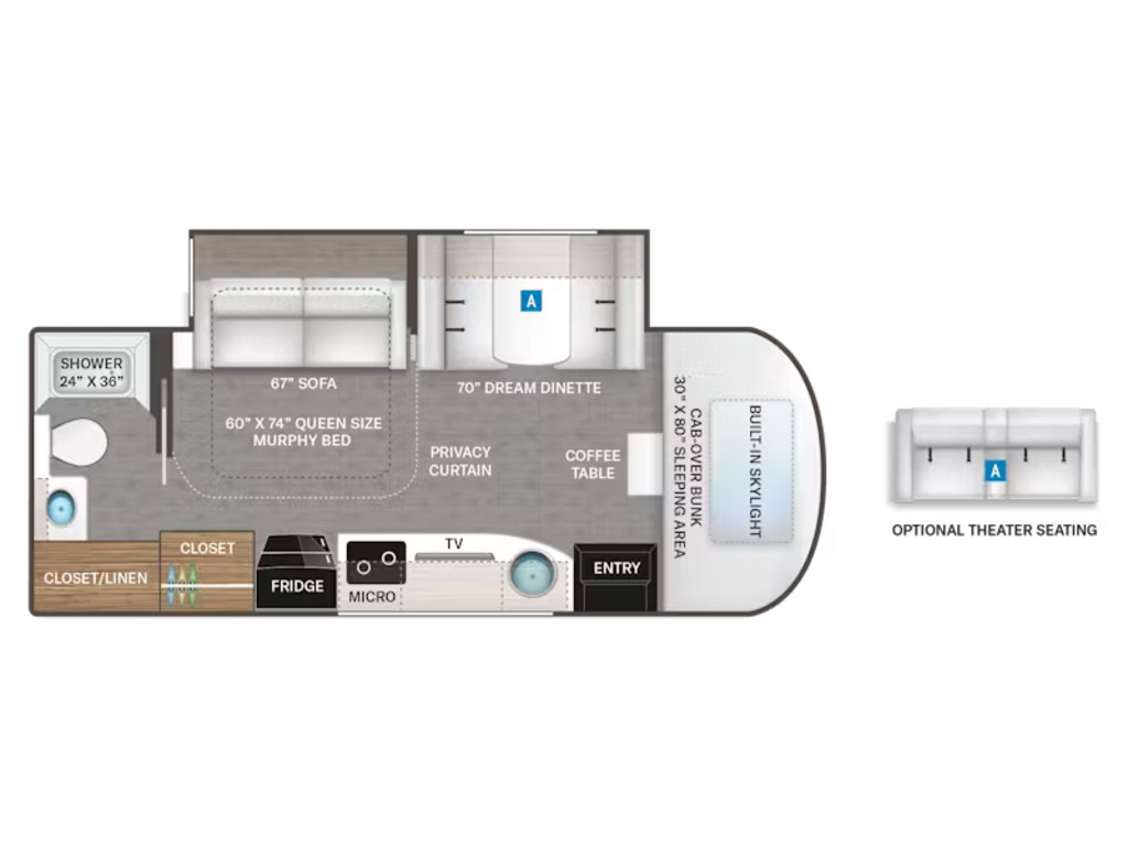 Disponible sur commande - Available on order Forest River Sunseeker 2500 3 extensions CLASSE C / B+ Skirt paint, Tissu : Slate , boiseries : Vermont o...