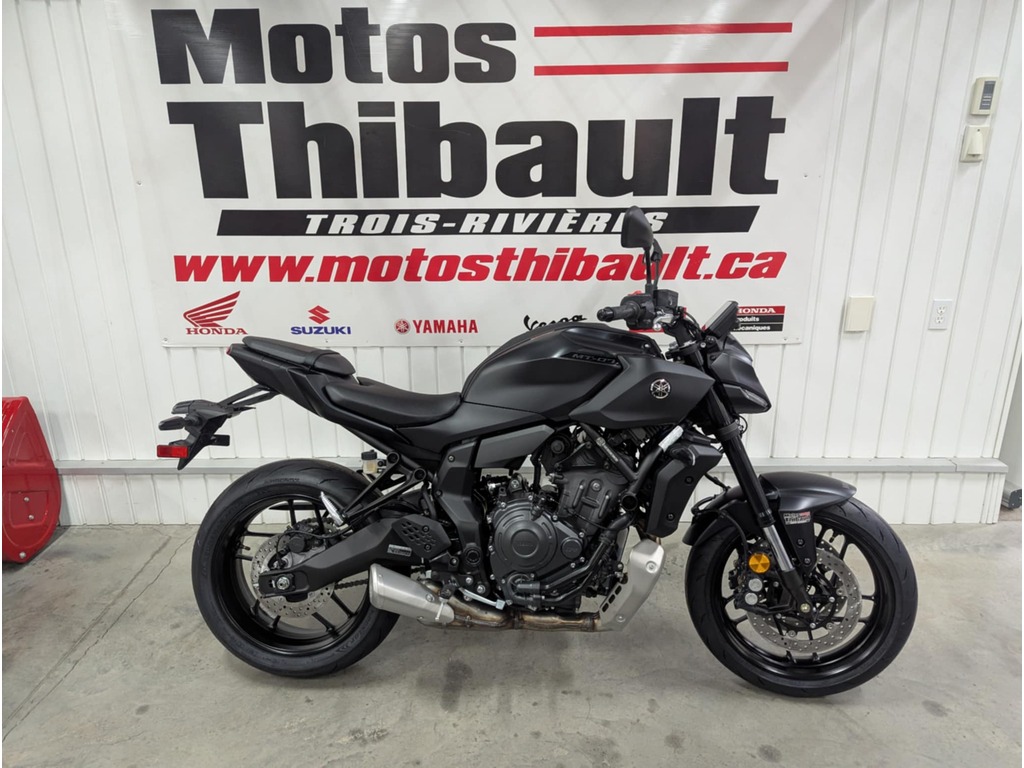 2025 YAMAHA MT07 NOIR **PROMOTION 750$ DE RABAIS ( DÉJÀ RÉDUIT DU PRIX )OU TAUX D'INTÉRETS 1.99% SUR 24-36 MOIS, 2.99% SUR 48 MOIS , 3.99% SUR 60 MOIS. -Fourche inversée de 41 mm et amortisseur arrière réglable -Position de conduite agressive -Commande électronique des gaz YCC-T, modes de conduite YRC et système d’antipatinage (TCS) désactivable -Technologie innovante d’amplification acoustique pour une expérience sonore optimisée -Jantes légères forgées par rotation et chaussées de pneus à carcasse radiale Dunlop Sportmax -Nouvel écran TFT couleur de 5 po avec connectivité et navigation par téléphone intelligent -Moteur CP2 EU5+ de 690 cm3 à couple élevé -Freins avant à deux disques à montage radial avec étriers à 4 pistons -Nouveau bloc de commutateurs intuitifs et clignotants à extinction automatique -Garnitures de haute qualité et matériaux haut de gamme * Chez MotosThibault les FRAIS DE TRANSPORT ET PRÉPARATION sont inclus dans le prix . Taxes de vente en sus.* *MOTOS THIBAULT situe a Trois-Rivieres dans le secteur Cap-de-la-Madelaine en Mauricie 205, rue Dessureault, Trois-Rivieres G8T 2L7 819-375-2222. Prenez la sortie 203 boul. Thibeau Sud. Venez decouvrir notre vaste inventaire de Motos ainsi que VTT neufs et usages de HONDA, YAMAHA, SUZUKI, APRILIA, VESPA, PIAGGIO . Visiter notre site web au www.motosthibault.ca