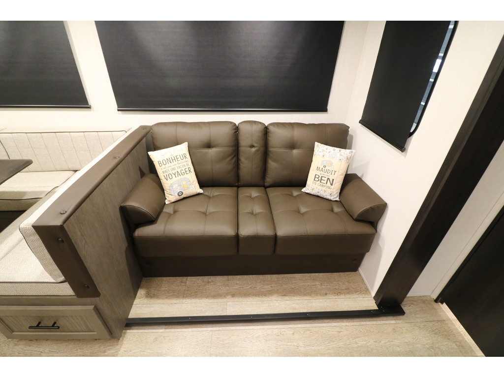 ALPHA WOLF 280QBS 2026 Roulotte familiale avec un poids de 6600 livres INTÉRIEUR: - Belle cuisine de couleurs pâles équipée d'un évier double, d'une cuisinière avec dessus vitrée, d'un micro-ondes et d'un grand réfrigérateur - Grande banquette en U qui se transforme en lit - Causeuse en cuir qui se transforme en lit - Foyer électrique - Système d'aspiration pour faciliter le nettoyage de la roulotte - Chambre arrière fermée avec 3 lits superposés et banquette simple qui se transforme en lit - Chambre avant avec grand lit et rangement tout autour - Salle de bain toute équipée avec une belle vanité EXTÉRIEUR: - Auvent électrique - Jack électrique - Marches ultra robustes - Frigo extérieur et machine à glace - Coffre de rangement photos à titre indicatif