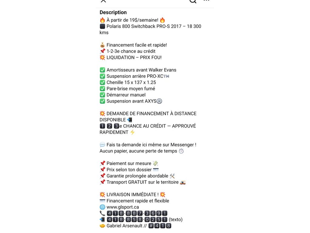 Polaris 800 Switchback PRO-S 2017 Financement facile et rapide! Très bas taux d'intérêt! Amortisseurs avant Walker Evans Suspension arrière PRO-XC™ Chenille 15 x 137 x 1.25 Pare-brise moyen fumé Démarreur manuel Suspension avant AXYS® Livraison Gratuite, Rapide et Courtoise Partout dans la Grande Région de Chaudière-Appalaches !!! 1ère - 2e - 3e chance au crédit, chez GL Sport, faut que ça se règle !! Financement Disponible Sur Place, Par Téléphone et Directement Sur Notre Site Internet Garantie Prolongée disponible : 24, 36, 48 et 60 mois !! Pour plus d'infos : Gabriel Arsenault, poste 418 ou Alexandre Gobeil, poste 413 au 418-478-4240 GL SPORT 94 rue principale, Saint-Gervais Sortie 337 de l'autoroute 20 Le plus grand inventaire sur la Rive-Sud de Québec ! Dépositaire des marques : Polaris, Yamaha, CFMoto, Piaggio et Vespa. Mots clés : VTT, Côte à Côte, Moto, Scooter, Cyclomoteur, Motoneige, Ski-Doo---- Polaris 800 Switchback PRO-S 2017 Financement facile et rapide! Très bas taux d'intérêt! Amortisseurs avant Walker Evans Suspension arrière PRO-XC™ Chenille 15 x 137 x 1.25 Pare-brise moyen fumé Démarreur manuel Suspension avant AXYS® Livraison Gratuite, Rapide et Courtoise Partout dans la Grande Région de Chaudière-Appalaches !!! 1ère - 2e - 3e chance au crédit, chez GL Sport, faut que ça se règle !! Financement Disponible Sur Place, Par Téléphone et Directement Sur Notre Site Internet Garantie Prolongée disponible : 24, 36, 48 et 60 mois !! Pour plus d'infos : Gabriel Arsenault, poste 418 ou Alexandre Gobeil, poste 413 au 418-478-4240 GL SPORT 94 rue principale, Saint-Gervais Sortie 337 de l'autoroute 20 Le plus grand inventaire sur la Rive-Sud de Québec ! Dépositaire des marques : Polaris, Yamaha, CFMoto, Piaggio et Vespa. Mots clés : VTT, Côte à Côte, Moto, Scooter, Cyclomoteur, Motoneige, Ski-Doo