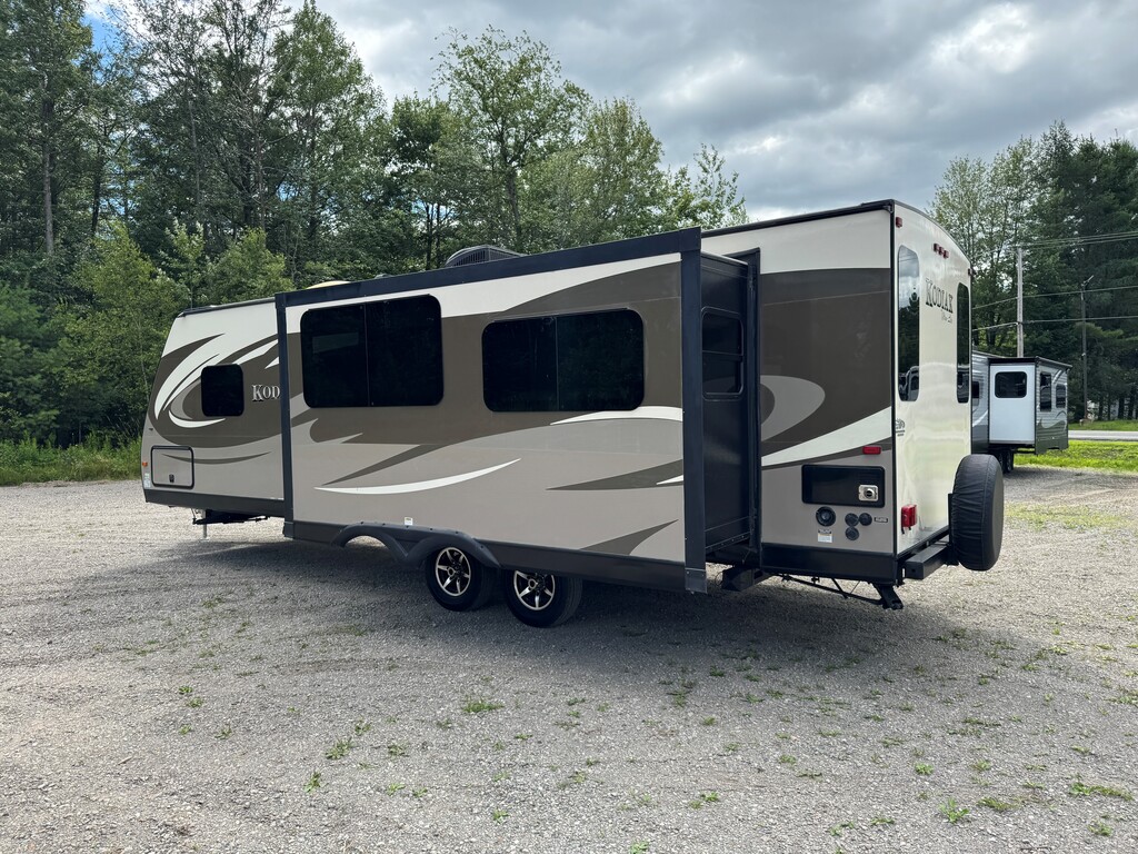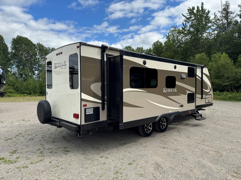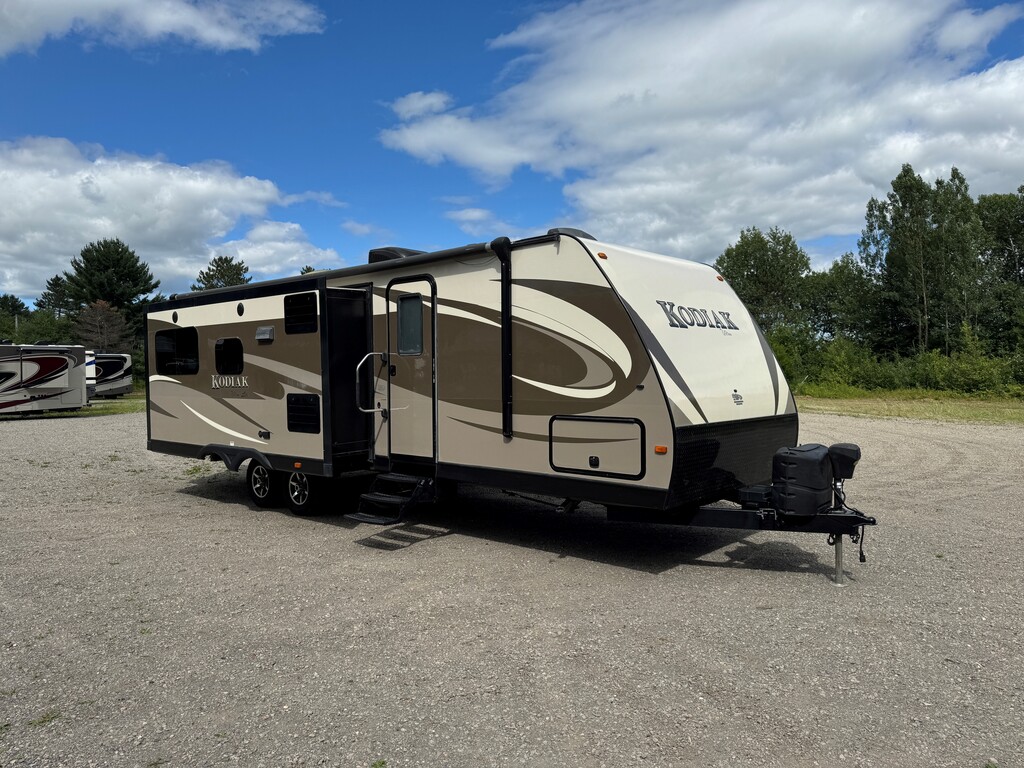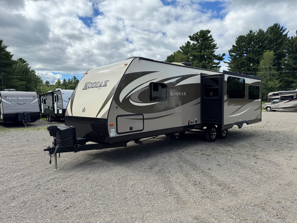 Dutchmen Kodiak 291RESL 2016 Il s'agit d'une SUPERBE caravane de voyage et peut être remorquée facilement par un camion d'une demi-tonne. Deux glissières complètes opposées ouvrent l'arrière de la caravane sur un immense espace de vie avec une grande cuisine et des espaces de couchage supplémentaires. La salle de bain dispose d'une grande douche et de toilettes en porcelaine. La chambre principale avec lit queen qui vous offrira une nuit de sommeil parfaite après une longue journée au camping. Avec une unité de climatisation dans la cabine principale, il y a également un emplacement pré-câblé dans la chambre pour une deuxième climatisation !