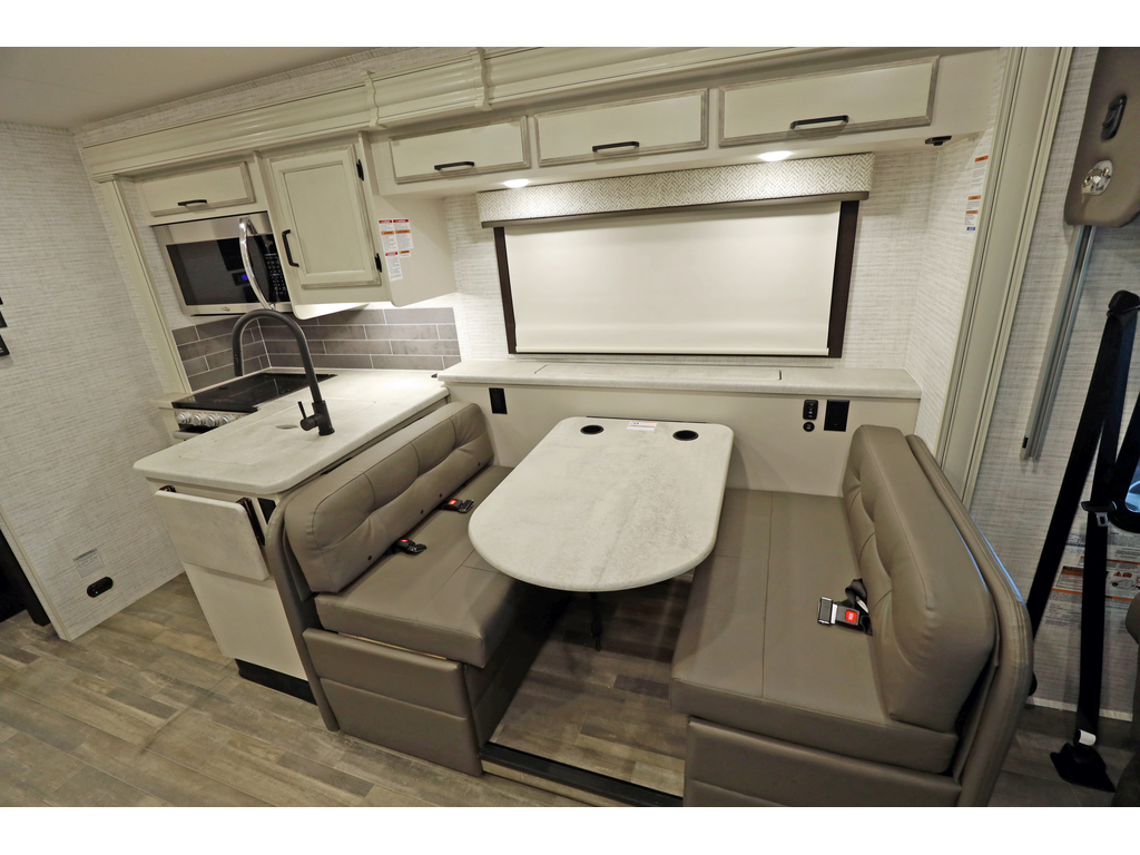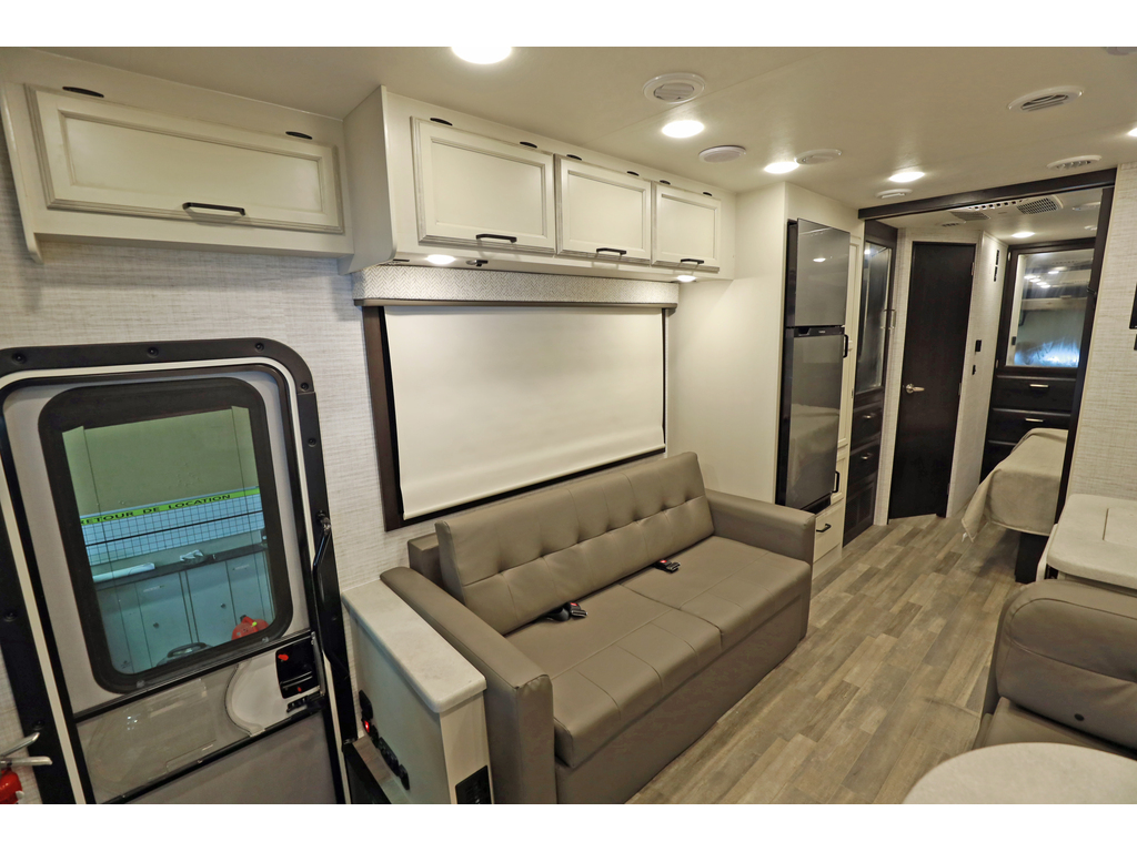Entegra Vision 27A 2 extension , lumières LED améliorées sous le comptoir et au-dessus du fascia, profil de caméra de vue arrière , . Ce magnifique VR comprend 2 extensions, un lit king size, un aménagement confortable et spacieux, des vérins de nivellement hydrauliques automatiques, un châssis Ford F53. Ce véhicule de plaisance étonnant comprend un ensemble valeur client qui comprend des caméras de recul et de vue latérale, un auvent électrique avec lumières LED, un centre de divertissement extérieur avec TV et DVD / radio, un système d'infodivertissement, une télévision LED dans le salon, des stores à rouleau, un toit en fibre de verre couronné sans couture et auvents à couvercle coulissant. L'équipement en option comprend une couchette avant. La liste impressionnante de caractéristiques standard de la Vision qui le distingue vraiment de la concurrence comprend la garantie inégalée de 2 ans d'Entegra, un cap avant en fibre de verre d'une seule pièce, un pare-brise panoramique avec pare-brise électrique, un toit en fibre de verre couronné sans couture, un roulement à billes guides de tiroirs, grande douche et bien plus encore Entegra Vision 27A 2 slides New exterior graphics package, bed outlets added to inverter, upgraded LED lights below countertop and above fascia, upgraded sleeker rear view camera profile, new hardwood fascia, and all theater seating has been upgraded to a center console with cup holders. This beautiful RV features 2 slide-out rooms, king size bed, a comfortable, spacious layout, automatic hydraulic leveling jacks, Ford F53 chassis. This amazing RV boasts Customer Value Package which features backup & side-view cameras with monitor, electric awning with LED lights, exterior entertainment center with TV & DVD/radio, infotainment system, LED TV in living room, roller shades, seamless crowned fiberglass roof and slide-out cover awnings. Optional equipment includes a front overhead bunk. The Vision's impressive list of standard features that truly set it apart from the competition include Entegra's unparalleled 2 year warranty, one-piece fiberglass front cap, panoramic windshield with power shade , seamless crowned fiberglass roof, ball-bearing drawer guides, large shower and much more