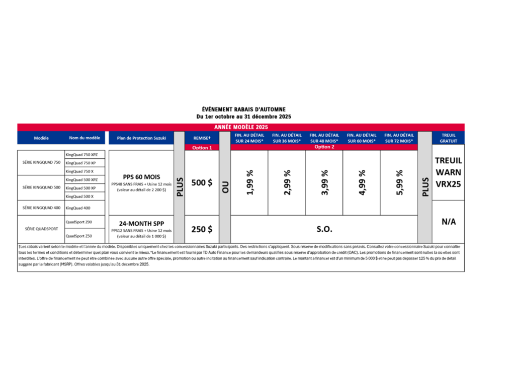??????À choisir jusqu'au 31 décembre : rabais en argent $500 (déja appliqué) ou financement a taux bas (VOIR PHOTO) + 5 ans de garantie (valeur au détail de $2200) et treuil Warn 2500 livres (valeur au détail de $659.49 plus (pose inclus) ??-Livraison disponible, Rapide et Courtoise dans les environs ??-1ère - 2e - 3e chance avec spécialistes du crédit !! ??-Frais de transport et préparation inclus !! ?Suzuki, l'inventeur du VTT à 4 roues, a créé le meilleur véhicule utilitaire sport au monde avec un style audacieux, et plus de capacités et de fiabilité que jamais. Un chapitre nouveau et passionnant s'ajoute à l'héritage de l'emblématique KingQuad, et vous pouvez le vivre dès maintenant. Le KingQuad 750XPZ 2025 avec direction assistée est facile à piloter sur tous les terrains grâce aux capacités qu'un KingQuad possède. - Moteur 750cc monocylindre - Transmission Automatique CVT QuadMaticMC - 4WD sur demande avec barrure de différentiel avant - Injection électronique - Direction Assistée - Suspension avant à double bras triangulé - Plateaux de chargement en plastique haute densité - Roues de mags - Pneus Carlisle - Phare au guidon de 35W - Capacité de remorquage de 1322lbs - Tableau de bord numérique - Prise 12V - Protège-mains - Attache remorque - style audacieux et angulaire - Position de conduite détendue À qui la chance ?? ** Financement et garantie prolongée disponible sur place, par téléphone et directement sur notre site internet ** Au plaisir de vous servir? ?? Richard Brousseau Vente en ligne ?? sans frais 1-866-983-3212 4?? 1??8??3??8??3??3??2??1??2?? Poste 1??2??2??7??pour Richard ou 1??2??2??5?? pour Éric texto = 418-625-0597 www.mbrousseau.com e-mail= mbrousseau@sogetel.net Concessionnaire ????? Mots clef : VTT, côte à côte, side by side, SXS, RZR, 4 roue, General.Polaris,Suzuki,VP,Captain
