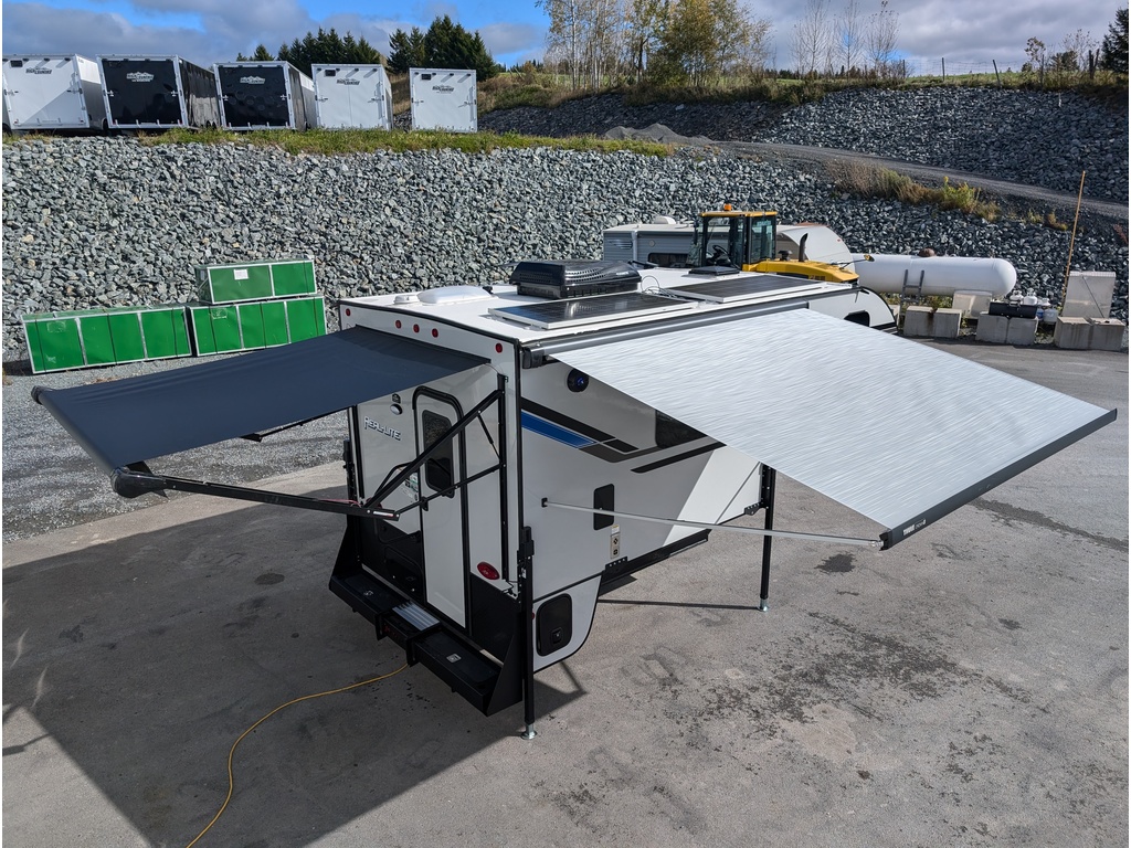 Options : Réservoir de propane, Douche, Toilette, Lit queen-size, Téléviseur, Cuisinière, Four, Hotte, Fourneau, Auvent, Chauffe-eau