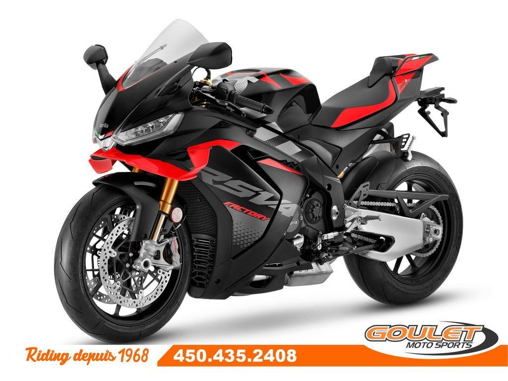 APRILIA RSV4 V4 1100 FACTORY 2025 - DARK KRAKEN   \*\*\* TRANSPORT ET PRÉPARATION INCLUS DANS LE PRIX \*\*\*   La moto Super Sportive dérivé de la course par Aprilia. La réputation de la RSV4 n'est plus à faire grâce à son moteur unique V4 de 220hp. Désormais dotée de winglets intégrés, d'une efficacité aérodynamique améliorée, associés au châssis unique d'Aprilia, son nouveau bras oscillant et son package électronique complet, la Aprilia RSV4 est la reine de la catégorie sport.   - Moteur amélioré : Nouveau moteur V4 de 1099 cm³, offrant 220 chevaux pour une performance maximale sur route et circuit.  - Suspension Öhlins Smart EC 2.0 : Suspension électronique de haute performance, permettant un ajustement en temps réel.  - Système APRC de dernière génération : Nouvelles versions des systèmes Traction Control, Wheelie Control, et Launch Control  - Design retravaillé : Nouveau carénage plus aérodynamique et un look plus agressif, améliorant la stabilité à haute vitesse.  - Écran TFT couleur : Nouveau tableau de bord avec interface Bluetooth  - Freins Brembo avec Cornering ABS : Technologie avancée pour une sécurité maximale en courbe et un freinage ultra-réactif.  - Batterie lithium-ion : Moins de poids et meilleure performance énergétique.  - Nouveaux modes de conduite : Cinq modes sélectionnables pour adapter la moto à différentes conditions de conduite.  - Commandes avec rétroéclairage LED : Les boutons sont désormais rétroéclairés, offrant une meilleure visibilité dans des conditions de faible éclairage.   Cette unité est chez Goulet Moto Sports de Ste-Thérèse. Téléphonez au 450.435.2408   Possibilité de financement avec plusieurs institutions financières. 2ième chance au crédit disponible.   Goulet Moto Sports est votre concessionnaire moto depuis 1968. Fier représentant officiel des marques HONDA, APRILIA, MOTO GUZZI, VESPA, PIAGGIO, KTM, NIU, SURRON et URAL pour le grand Montréal. Nous avons un énorme choix de moto usagés inspectées par nos professionnels. 2 adresses pour vous servir, soit à Sainte-Thérèse (450.435.2408) et Saint-Jérôme (450.431.6622).   Goulet Moto Sports ne peut être tenu responsable d'une omission, d'un délai ou d'une erreur de transcription de l'information. Le prix affiché reflète la condition de l'unité. Pour différentes raisons les prix peuvent différer de ceux indiqués en ligne. Les données sont affichées à titre indicatif seulement et ne peuvent être considérées comme une information contractuelle. Nous vous encourageons vivement à nous consulter pour plus de détails avant de vous déplacer. Des frais tels que taxes, immatriculation, administrations ou autres peuvent s'appliquer.   Se compare avantageusement à une BMW S1000RR, Ducati Panigale, Yamaha R1, Kawasaki ZX-10, Suzuki GSXR1000  Essence, Transmission: Manuelle, 6 vitesses, Système de refroidissement: Refroidi au liquide, 4 cylindres, 220.0 CV, 1099.0 CC, Garantie: 2 ANS  ----------------------  APRILIA RSV4 V4 1100 FACTORY 2025 - DARK KRAKEN   \*\*\* TRANSPORT AND PREPARATION INCLUDED IN THE PRICE \*\*\*   The Super Sport bike derived from racing by Aprilia. The reputation of the RSV4 is well established thanks to its unique V4 engine producing 220hp. Now equipped with integrated winglets, improved aerodynamic efficiency, combined with Aprilia's unique chassis, new swingarm, and a complete electronic package, the Aprilia RSV4 is the queen of the sport category.   - Improved Engine: New 1099 cm³ V4 engine, delivering 220 horsepower for maximum performance on both road and track.  - Öhlins Smart EC 2.0 Suspension: High-performance electronic suspension for real-time adjustments.  - Next-Generation APRC System: New versions of Traction Control, Wheelie Control, and Launch Control systems,  - New Electronics: Enhanced Ride-by-Wire system for finer throttle and power management.  - Redesigned Aesthetics: New, more aerodynamic fairing with a more aggressive look, improving stability at high speeds.  - Color TFT Display: New dashboard with Bluetooth interface for modern connectivity and more precise riding information.  - Brembo Brakes with Cornering ABS: Advanced technology for maximum safety in corners and ultra-responsive braking.  - Lithium-ion Battery: Lighter weight and better energy performance.  - New Riding Modes: Five selectable modes to adapt the bike to different riding conditions.  - Backlit LED Command Buttons: Buttons are now backlit for better visibility in low light conditions.   This unit is available at Goulet Moto Sports in Ste-Thérèse. Call us at 450-435-2408.   Financing options available through multiple financial institutions. 2nd chance credit available.   Goulet Moto Sports has been your motorcycle dealer since 1968. Proud official representative of the brands HONDA, APRILIA, MOTO GUZZI, VESPA, PIAGGIO, KTM, NIU, SURRON, and URAL for the Greater Montreal area. We offer a huge selection of professionally inspected used motorcycles. We have two locations to serve you: Sainte-Thérèse (450-435-2408) and Saint-Jérôme (450-431-6622).   Goulet Moto Sports cannot be held responsible for omissions, delays, or transcription errors. The displayed price reflects the condition of the unit. Prices may differ for various reasons from what is indicated online. The information is provided for guidance purposes only and should not be considered contractual. We strongly recommend that you consult us for more details before coming in. Additional fees such as taxes, registration, administration, or others may apply.   Compares favorably to a BMW S1000RR, Ducati Panigale, Yamaha R1, Kawasaki ZX-10, Suzuki GSXR1000  Gasoline, Transmission: Manual, 6 speeds, Cooling System: Liquid cooling, 4 cylinders, 220.0 HP, 1099.0 CC, Warranty: 2 ANS