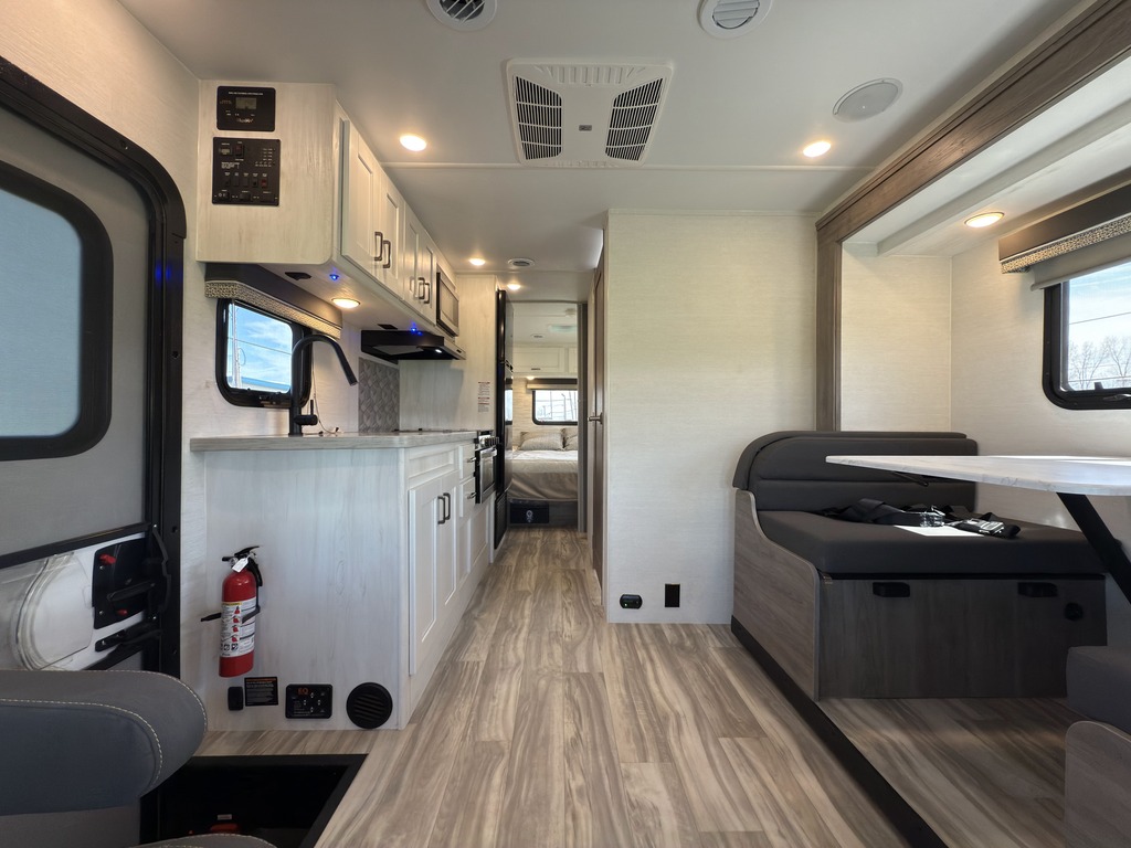 Options : Génératrice à essence, Réservoir de propane, Climatiseur conduit central, Vitres électriques, Miroirs électriques, Régulateur de vitesse, Volant inclinable, Caméra Marche arrière, Cric hydraulique, Échelle, Attache-remorque, Douche, Toilette, Lit queen-size, Prise électrique, Antenne pour téléviseur, Micro-onde, Cuisinière, Four, Hotte, Fourneau, Auvent, Chauffe-eau