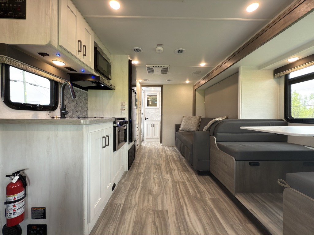 Options : Génératrice à essence, Réservoir de propane, Climatiseur conduit central, Vitres électriques, Miroirs électriques, Régulateur de vitesse, Volant inclinable, Caméra Marche arrière, Cric hydraulique, Douche extérieure, Échelle, Attache-remorque, Douche, Toilette, Lit queen-size, Antenne pour téléviseur, Micro-onde, Cuisinière, Four, Hotte, Fourneau, Auvent, Chauffe-eau