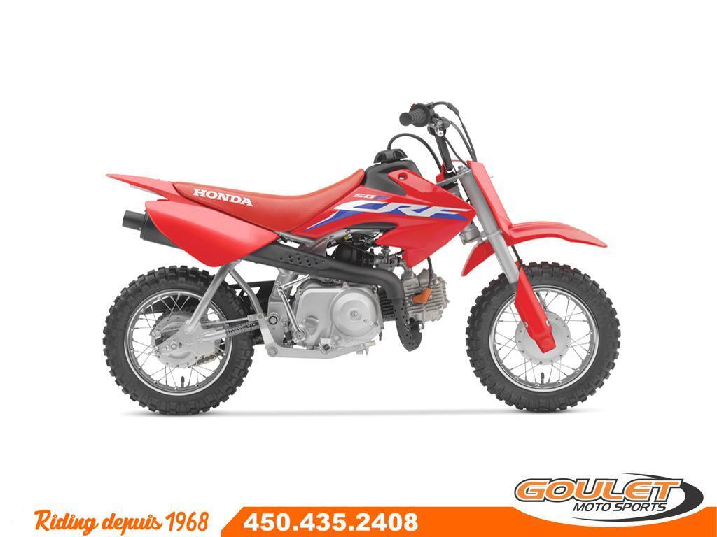 HONDA CRF 50F 2022   \*\*\* Pour seulement 2199$ Valeur de 2649$ - Moto Neuve - Garantie Honda complète \*\*\*   Petite mais redoutable, la Honda CRF50F 2022 est la porte d'entrée parfaite dans l'univers de la moto tout-terrain. Grâce à sa hauteur de selle basse, son moteur fiable et sa transmission à 3 vitesses avec embrayage automatique, elle est idéale pour les jeunes pilotes qui débutent en toute confiance.   - Moteur monocylindre 49cc à 4 temps, refroidi par air  - Démarreur à kick fiable et facile à utiliser  - Transmission à 3 vitesses avec embrayage automatique  - Hauteur de selle de seulement 548 mm (21,6 po) pour un meilleur contrôle  - Suspension avant télescopique et monoamortisseur arrière pour plus de confort   Cette unité est chez Goulet Moto Sports de Ste-Thérèse. Téléphonez au 450.435.2408  Possibilité de financement avec plusieurs institutions financières. 2? chance au crédit disponible.   Goulet Moto Sports est votre concessionnaire moto depuis 1968. Fier représentant officiel des marques HONDA, APRILIA, MOTO GUZZI, VESPA, PIAGGIO, KTM, NIU, SURRON et URAL pour le Grand Montréal. Nous avons un énorme choix de motos usagées inspectées par nos professionnels.  2 adresses pour vous servir : Sainte-Thérèse (450.435.2408) et Saint-Jérôme (450.431.6622).   Goulet Moto Sports ne peut être tenu responsable d'une omission, d'un délai ou d'une erreur de transcription de l'information. Le prix affiché reflète la condition de l'unité. Pour différentes raisons, les prix peuvent différer de ceux indiqués en ligne. Les données sont affichées à titre indicatif seulement et ne peuvent être considérées comme une information contractuelle. Nous vous encourageons vivement à nous consulter pour plus de détails avant de vous déplacer. Des frais tels que taxes, immatriculation, administration ou autres peuvent s'appliquer.  Essence, 3 vitesses, Système de refroidissement: Refroidi à l'air, 50.0 CC, Garantie: 6 mois  ----------------------  2022 HONDA TRAIL CRF 50R   \*\*\* For only $2199 Value of $2649 - New Motorcycle - Full Honda Warranty \*\*\*   Small but mighty, the 2022 Honda CRF50F is the perfect entry point into the world of off-road motorcycling. Thanks to its low seat height, reliable engine, and 3-speed transmission with automatic clutch, it's ideal for young riders looking to get started with confidence.   - Air-cooled, 49cc, 4-stroke, single-cylinder engine  - Reliable and easy-to-use kick starter  - 3-speed transmission with automatic clutch  - Seat height of only 548 mm (21.6 in) for better control  - Telescopic front suspension and single rear shock absorber for greater comfort   This unit is available at Goulet Moto Sports in Ste-Thérèse. Call 450.435.2408   Financing available with several financial institutions. Second chance credit available.   Goulet Moto Sports has been your motorcycle dealership since 1968. Proud official representative of HONDA, APRILIA, MOTO GUZZI, VESPA, PIAGGIO, KTM, NIU, SURRON, and URAL brands for Greater Montreal. We have a huge selection of used motorcycles inspected by our professionals.  2 locations to serve you: Sainte-Thérèse (450.435.2408) and Saint-Jérôme (450.431.6622).   Goulet Moto Sports cannot be held responsible for any omissions, delays, or transcription errors. The price displayed reflects the condition of the unit. For various reasons, prices may differ from those indicated online. The data displayed is for informational purposes only and should not be considered contractual information. We strongly encourage you to contact us for more details before traveling. Fees such as taxes, registration, administration, or others may apply.  Gasoline, 3 speeds, Cooling System: Air cooling, 50.0 CC, Warranty: 6 mois