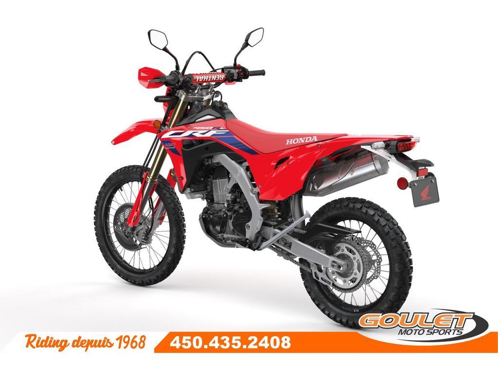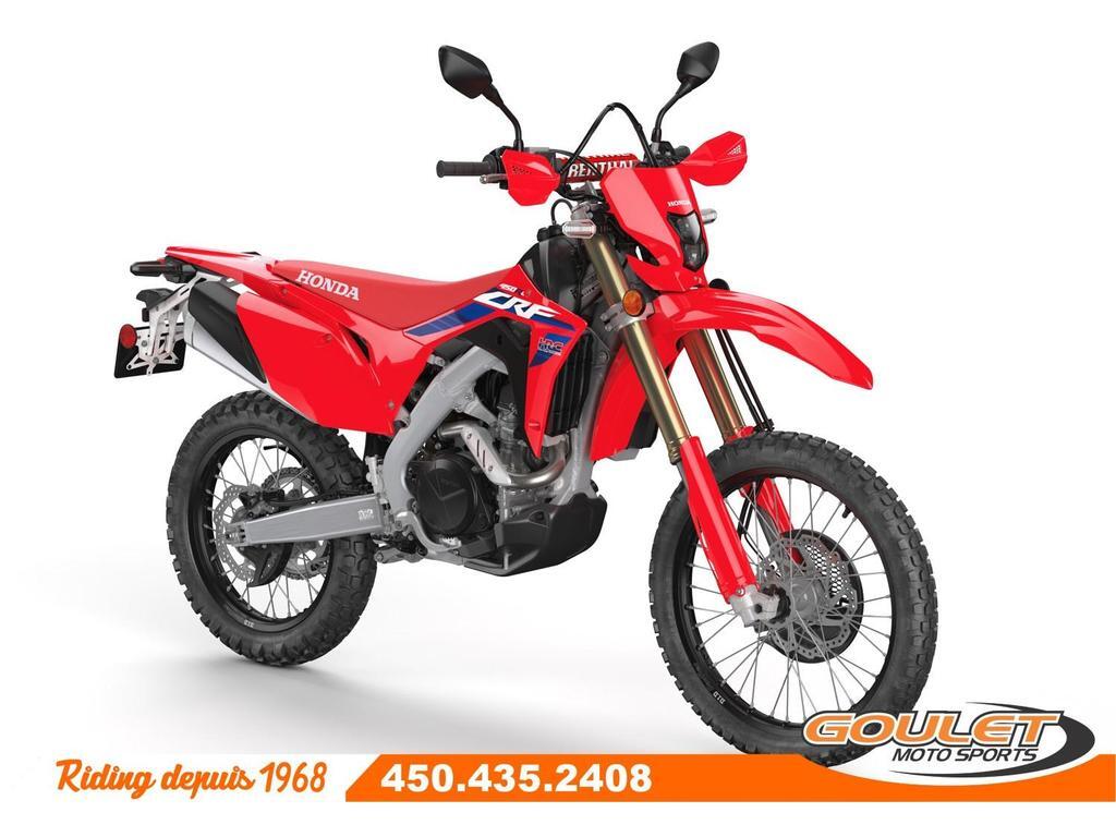 HONDA CRF 450RL 2023   \*\*\* Rabais de 1349$ pour un prix final de 11995$ - Moto neuve, pleine garantie Honda \*\*\*   La CRF450RL, conçue à partir de la moto de motocross CRF450R, a été adaptée pour rouler à merveille sur la route. À partir de la CRF450R, le cadre a été légèrement élargi pour faire place à la transmission à 6 vitesses. Le moteur a été calibré pour assurer une transmission de la puissance en douceur, et la suspension et les freins ont été améliorés afin que la moto soit plus conviviale sur les sentiers étroits et sur la route.   - Moteur unicam de 450cc refroidi par liquide à injection. Le moteur génère plus d'inertie pour offrir un maximum de couple.  - Moteur à durabilité accrue comparativement au CRF450R grâce au piston à 3 segments.  - Transmission à 6 vitesses pour rouler sur autoroute  - Intervale d'entretien large qui se fait aux 32000km, beaucoup moins fréquent qu'une moto compétition.  - Indicateur d'économie d'essence  - Éclairage DEL   Transport et préparation inclus dans le prix   Cette unité est chez Goulet Moto Sports de Ste-Thérèse. Téléphonez au 450.435.2408   Possibilité de financement avec plusieurs institutions financières. 2ième chance au crédit disponible.   Goulet Moto Sports est votre concessionnaire moto depuis 1968. Fier représentant officiel des marques HONDA, APRILIA, MOTO GUZZI, VESPA, PIAGGIO, KTM, NIU, SURRON et URAL pour le grand Montréal. Nous avons un énorme choix de moto usagés inspectées par nos professionnels. 2 adresses pour vous servir, soit à Sainte-Thérèse (450.435.2408) et Saint-Jérôme (450.431.6622).   Goulet Moto Sports ne peut être tenu responsable d'une omission, d'un délai ou d'une erreur de transcription de l'information. Le prix affiché reflète la condition de l'unité. Pour différentes raisons les prix peuvent différer de ceux indiqués en ligne. Les données sont affichées à titre indicatif seulement et ne peuvent être considérées comme une information contractuelle. Nous vous encourageons vivement à nous consulter pour plus de détails avant de vous déplacer. Des frais tels que taxes, immatriculation, administrations ou autres peuvent s'appliquer.   Se compare a une KTM 390 Enduro R, KTM 500 EXC-F, 350 EXC-F, Suzuki DRZ 400, Husqvarna 701 Enduro, Husqvarna FE 501 FE 350  Essence, Transmission: Manuelle, 6 vitesses, Système de refroidissement: Refroidi au liquide, 1 cylindres, 450.0 CC, Garantie: 1 an  ----------------------  2023 HONDA CRF 450RL   \*\*\* $1,349 discount for a final price of $11,995 - New motorcycle, full Honda warranty \*\*\*   The CRF450RL, based on the CRF450R motocross bike, has been adapted to ride great on the road. Starting with the CRF450R, the frame has been widened slightly to make room for the 6-speed transmission. The engine has been tuned to deliver smooth power transmission, and the suspension and brakes have been upgraded to make the bike more user-friendly on tight trails and on the road.   - 450cc liquid-cooled unicam engine with injection. The motor generates more inertia to deliver maximum torque.  - Engine with increased durability compared to the CRF450R thanks to the 3-ring piston.  - 6-speed transmission for highway riding  - Wide maintenance interval which is done at 32000km, much less frequent than a competition motorcycle.  - Fuel economy indicator  - LED lighting   This unit is at Goulet Moto Sports in Ste-Thérèse. Call 450.435.2408   Possibility of financing with several financial institutions. 2nd chance credit available.   Goulet Moto Sports has been your motorcycle dealer since 1968. Proud official representative of the HONDA, APRILIA, MOTO GUZZI, VESPA, PIAGGIO, KTM, NIU, SURRON and URAL brands for greater Montreal. We have a huge selection of used motorcycles inspected by our professionals. 2 addresses to serve you, in Sainte-Thérèse (450.435.2408) and Saint-Jérôme (450.431.6622).   Goulet Moto Sports cannot be held responsible for any omission, delay or transcription error in the information. The price displayed reflects the condition of the unit. For various reasons the prices may differ from those indicated online. The data is displayed for information purposes only and cannot be considered as contractual information. We strongly encourage you to consult us for more details before you travel. Fees such as taxes, registration, administration or others may apply.   Comparable to a KTM 390 Enduro R, KTM 500 EXC-F, 350 EXC-F, Suzuki DRZ 400, Husqvarna 701 Enduro, Husqvarna FE 501 FE 350  Gasoline, Transmission: Manual, 6 speeds, Cooling System: Liquid cooling, 1 cylinders, 450.0 CC, Warranty: 1 an