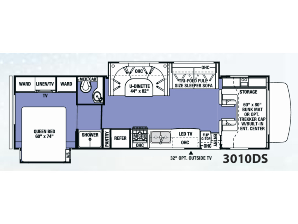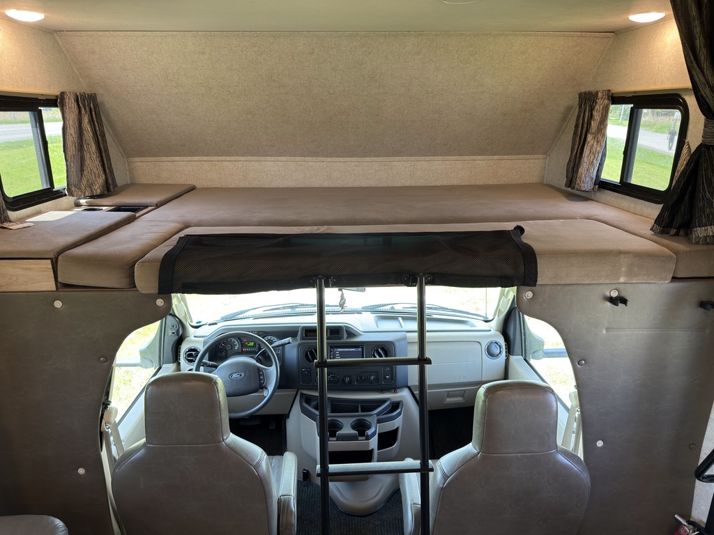 Options : Suspension pneumatique, Génératrice à essence, Réservoir de propane, Climatiseur conduit central, Vitres électriques, Miroirs électriques, Régulateur de vitesse, Volant inclinable, Caméra Marche arrière, Échelle, Attache-remorque, Douche, Toilette, Lit queen-size, Canapé-lit, Prise électrique, Téléviseur, Antenne pour téléviseur, Micro-onde, Cuisinière, Four, Hotte, Fourneau, Auvent, Chauffe-eau