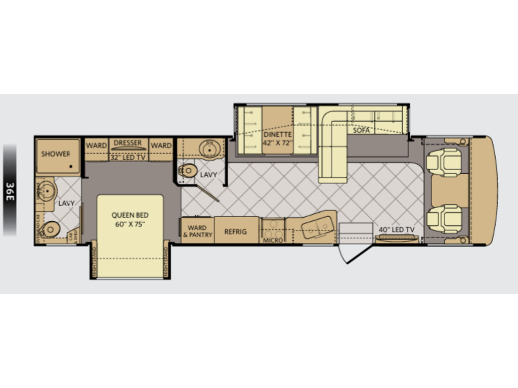 Options : Suspension pneumatique, Génératrice à essence, Réservoir de propane, Climatiseur conduit central, Miroirs électriques, Régulateur de vitesse, Volant inclinable, Caméra Marche arrière, Cric hydraulique, Échelle, Attache-remorque, Douche, Toilette, Laveuse, Lit queen-size, Prise électrique, Téléviseur, Antenne pour téléviseur, Micro-onde, Cuisinière, Auvent, Chauffe-eau