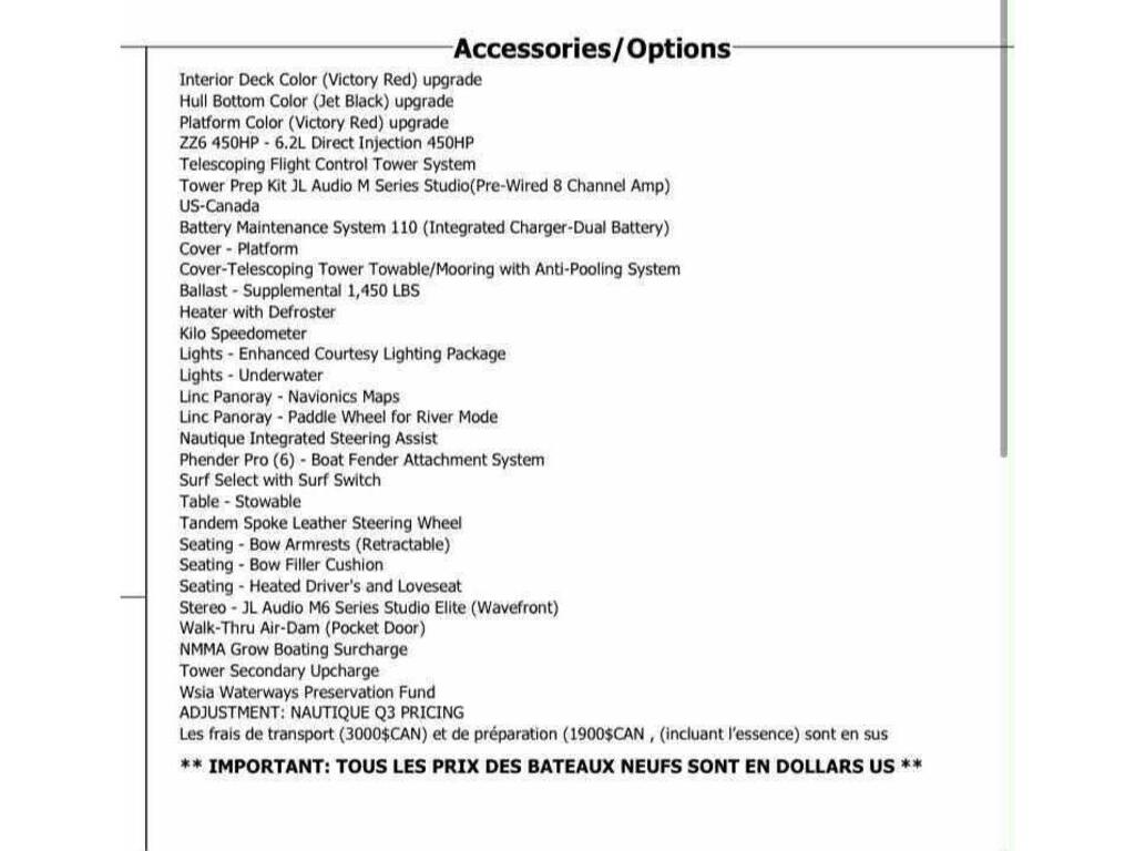 2022 SUPER AIR NAUTIQUE MODELE G-23   L'EMBARCATIONS HAUTE DE GAME DE WAKESURF ET SPORT NAUTIQUE   LE MEC ULTRA DU BATEAU DE PLAISANCE SPORTIVE   SEULEMENT 104.9 HEURES D'UTILISATION   BALANCE DE GARANTIE DISPONIBLE DU MANUFACTURIER JUSQU'EN 2027   ULTRA LUXUEUX, 1 SEUL PROPRIO. JAMAIS RESTER A L'EAU ET TOUJOURS ENTREPOSER DANS UN GARAGE INTERIEUR & ENTRETENUE MINITIEUSEMENT   MOTEUR V8 DE MARQUE PCM MARINE ZZ6 A INJECTION DIRECTE ET QUI DEVELOPPE 450 H.P   SYSTEME DE CONTROLE MYNAUTIQUE AVEC ECRAN COULEUR DE GRAND FORMAT POUR INDICATEUR DE VITESSE + RADIO + GPS + CONTROLEUR DE BALLAST + ECLAIRAGE + CHAUFFAGE ET +++   SYSTEME CONFIGURABLE HYDRO-PLATE RUNNING SURFACE   TOUR QUI S'ABAISSE ELECTRIQUE + TOIT BIMINI GRAND FORMAT DE COUELUR ASSORTIE   CAMERA COULEUR MONTER DIRECTEMENT SUR LA TOUR + SYSTEME DE BASE ROTATIVE PRET POUR CAMERA GOPRO   REMORQUE DE LUXE 2022 DE MARQUE BOAT MATE DE COULEUR ASSORTIE A TRIPLE ESSIEUX AVEC FREINS A DISQUE SUR CHAQUE ESSUIE + ENSEMBLE DE MAGS DE MARQUE MOTO METAL NOIR + ROUE DE SECOUR + ESCABLER D'EMBARQUEMENT AVANT AVEC TAPIS SEA-DECK + TAPIS SEA-DECK SUR AILE ET APPUIE PEDS + SYSTEME DE LUMIERE AUX DEL QUI PEUVENT ETRE CHANGER DE COULEUR VIA L'APPLICATION   ET BEAUCOUP PLUS!   SUR RENDEZ VOUS SEULEMENT ( 450-413-1515)   TOUTES NOS UNITÉES SONT MINUTIEUSEMENT CHOISIS,INSPECTÉES ET GARANTIES   FINANCEMENT DESJARDINS,NATIONALE OU SCOTIA   POUR CONFIRMER LA DISPONIBILITÉ OU INFO SVP COMMUNIQUER AVEC LE DÉPARTEMENT DES VENTES AU 450-413-1515 OU TEXTO AU 514-213-3163   FRAIS 99$ RDPRM +119$+TX PERMIS D'EMBARCATION