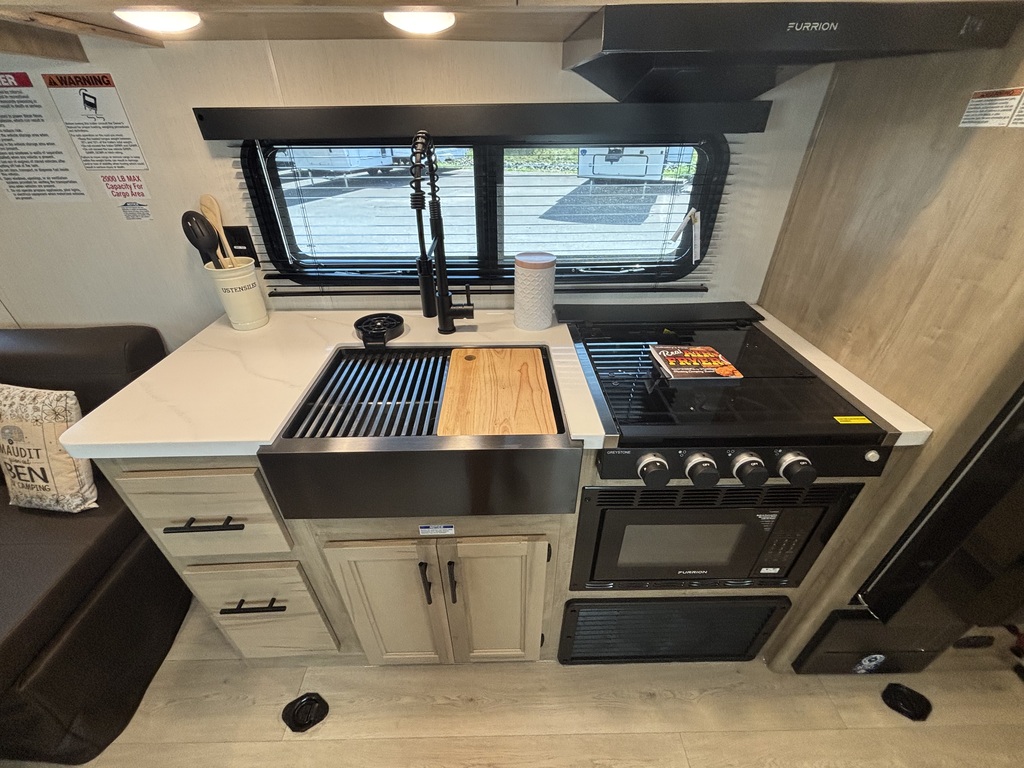 GREY WOLF 25RR BLACK LABEL 2026. Roulotte cargo avec un poids de 5300 livres INTÉRIEUR: - Cuisine avec comptoir robuste, évier double, cuisinière 3 ronds, micro-ondes convection et air fryer et grand réfrigérateur - Grande banquette en cuir qui se transforme en lit pour les invités - Chambre avant avec lit queen et rangement tout autour - Salle de bain avec belle vanité, beaucoup de rangement et douche en coin EXTÉRIEUR: - Marches ultra robustes - Jack électrique - Finition gel coat - Fenêtres sans contour - Coffres de rangement - Auvent électrique - Rampe cargo qui se transforme en patio photos à titre indicatif