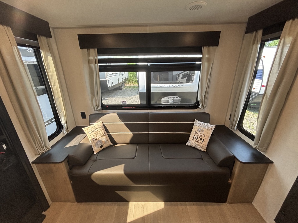 Grey Wolf 23MKBL 2026 Roulotte idéale pour un couple. Elle pèse 5000lbs. Elle possède une finition gel coat. La chambre avant fermée comporte un lit queen équipé de lumières de lecture et de rangement tout autour .La cuisine est munie d'un comptoir surface solide, d'un grand évier, d'une cuisinière 3 ronds et d'un micro-ondes convection-air fryer ainsi que d'un grand réfrigérateur. Il y a une banquette en U qui se transforme en grand lit supplémentaire en plus d'avoir des tiroirs très profond qui donne énormément de rangement. Cette roulotte a un contrôle électronique de la température ainsi qu'un beau foyer électrique. Vous serez enchanté par le confort du divan 3 places qui se transforme en lit ainsi qu'une grande fenestration avec finition sans contour. La salle de bain a une douche en coin et beaucoup de rangement. Elle est très bien équipée pour profiter de l'extérieur avec son auvent électrique et ses haut-parleurs extérieurs et son réfrigérateur extérieur. Elle est dotée de marches ultra-robustes et de stabilisateurs à installation rapide. Il y a beaucoup de rangement extérieur avec ses coffres équipés de loquets aimantés mains-libres Financement facile sur place. photos à titre indicatif