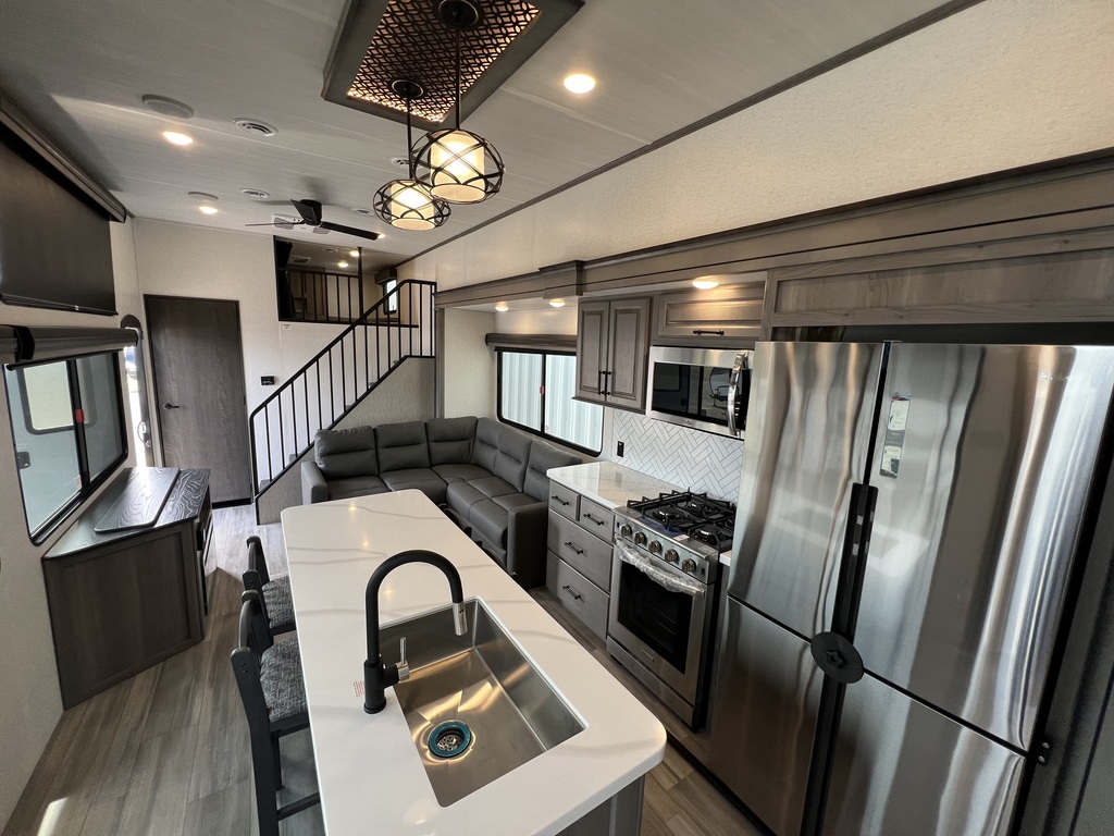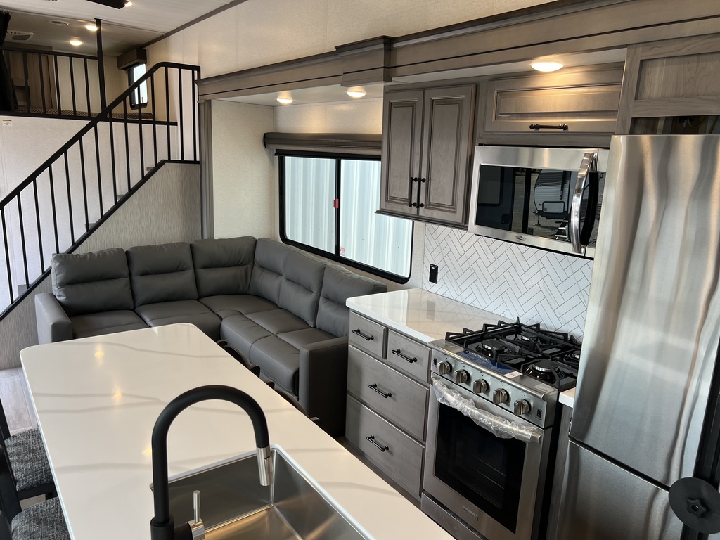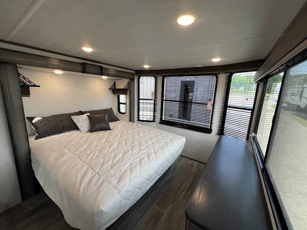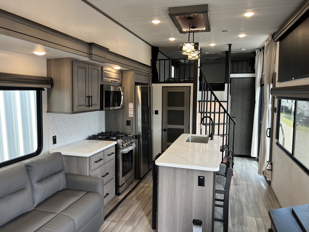 Cette magnifique roulotte de parc allie modernité et confort. Hauts plafonds de 8 pieds : sensation d'ouverture et de luminosité Chambre avant avec lit king Double loft : parfait pour les familles et les invités Salon et cuisine combinés : canapé sectionnel, îlot avec quatre tabourets de bar Grandes fenestrations et porte patio : accès facile, vues magnifiques et air frais Salle de bains spacieuse : 2 lavabos, grande douche avec siège, placard pour laveuse/sécheuse Vous vous sentirez chez vous dans cette Residence exceptionnelle! Intéressé(e) ? Venez voir ! Rien de mieux qu'une visite en personne pour solidifier votre opinion. Chez Roulottes Turmel, notre équipe motivée et dévouée saura vous rassurer et vous aider dans vos recherches. Notre but est d'offrir le meilleur service-conseil relatif aux véhicules récréatifs ainsi qu'aux produits de qualité s'y rattachant. Nous saurons trouver ce qui vous conviendra pour rendre vos futures expériences de voyage et de camping inoubliables. *L'unité en stock pourrait légèrement différer des images présentées.