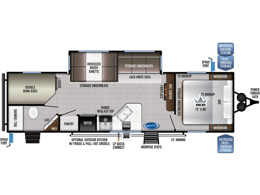 Options : Douche, Toilette, Lit double, Lits superposés, Lit arrière, Canapé-lit, Micro-onde, Cuisinière, Four