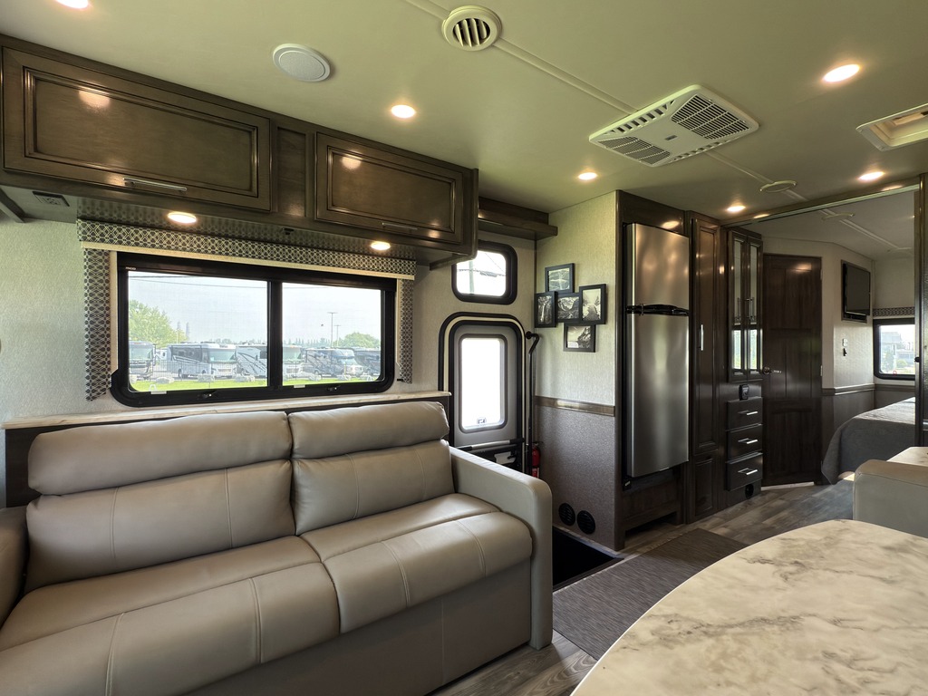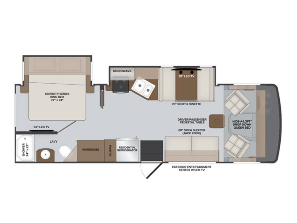 Options : Génératrice à essence, Réservoir de propane, Climatiseur conduit central, Miroirs électriques, Régulateur de vitesse, Volant inclinable, Caméra Marche arrière, Cric hydraulique, Douche extérieure, Échelle, Attache-remorque, Douche, Toilette, Lit arrière, Prise électrique, Téléviseur, Antenne pour téléviseur, Micro-onde, Cuisinière, Four, Fourneau, Auvent, Chauffe-eau
