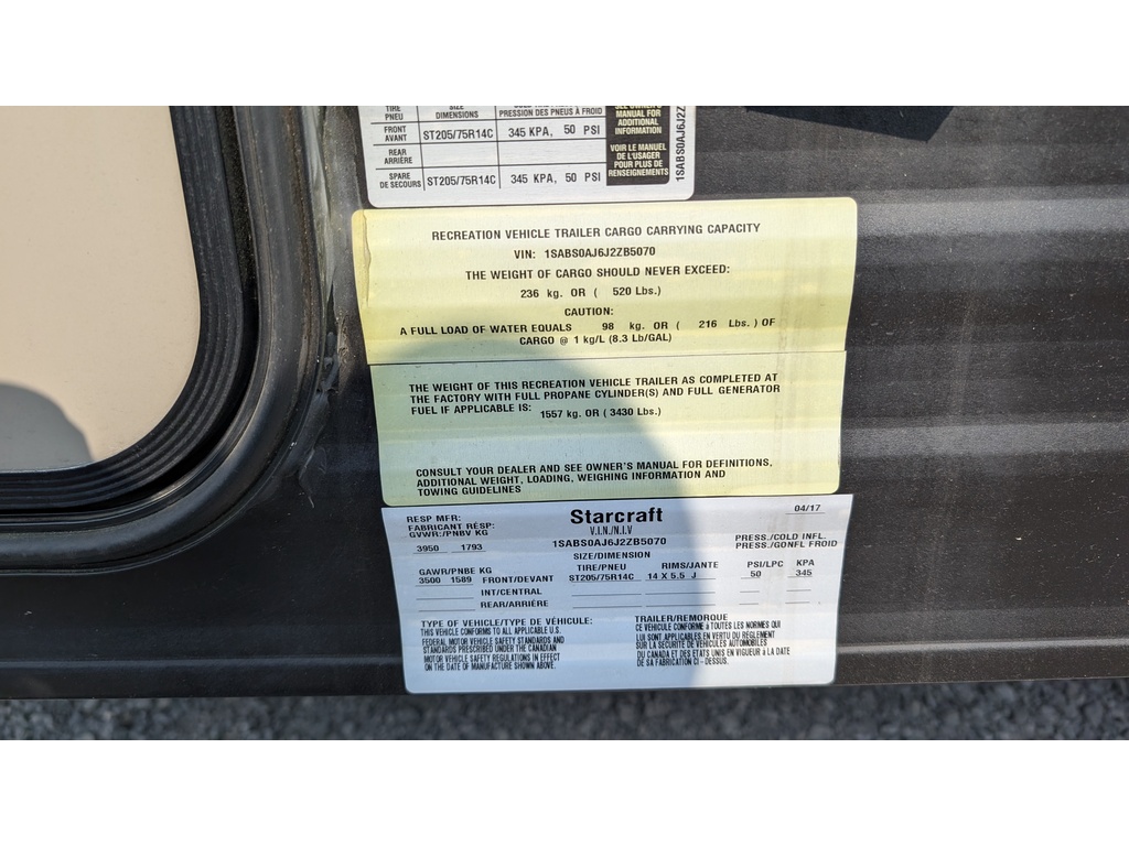 Starcraft Autumn Ridge 18BHS 2017 : Votre roulotte compacte pour des aventures familiales ! Découvrez cette roulotte de voyage légère, parfaite pour les petites familles ou couples cherchant confort et mobilité. Avec une longueur de 21 pieds 11 pouces et un poids à sec de 3268 lb, la Starcraft Autumn Ridge 18BHS 2017 est équipée d’une extension (slideout) pour un espace optimisé. Elle accueille jusqu’à 5 personnes, avec des lits superposés à l’arrière, un lit queen à l’avant et une dinette convertible.La cuisine fonctionnelle inclut un réfrigérateur compact (propane/électrique), une cuisinière 2 brûleurs et un micro-ondes. La salle de bain complète offre une douche, une toilette et un lavabo. Profitez d’une climatisation 8000 BTU, d’un chauffe-eau de 6 gallons, d’un auvent électrique de 12 pieds et d’un rangement pass-through. Les commodités incluent un plancher en vinyle, une construction en aluminium robuste et des réservoirs (20 gal. eau fraîche, 15 gal. eaux grises, 9 gal. eaux noires) pour une autonomie prolongée.Idéale pour le camping SEPAQ, les escapades en nature ou les courts séjours, la Starcraft Autumn Ridge 18BHS 2017 combine légèreté, qualité et prix abordable