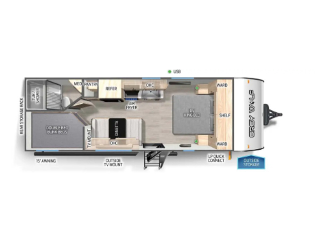 EN ROUTE!!! Grey Wolf 22MKSE 2025. Roulotte idéale pour la famille avec ses lits superposés (double/double). Pèse seulement 4300 lbs! La chambre avant fermée pour les adultes comporte un lit queen et un garde-robe de chaque côté de celui-ci. La cuisine est munie d'un grand évier, une cuisinière et un four avec dessus vitré. Il y a une banquette qui se transforme en lit supplémentaire en plus d'avoir du rangement. Cette roulotte a un grand réfrigérateur et l'air climatisé à contrôle électronique. La salle de bain a un bain douche et un ventilateur à haute capacité. Elle est très bien équipée pour profiter de l'extérieur avec son auvent électrique et ses haut-parleurs extérieurs. Pour faciliter la vie, il y a beaucoup de rangement extérieur. Financement facile sur place. photos à titre indicatif