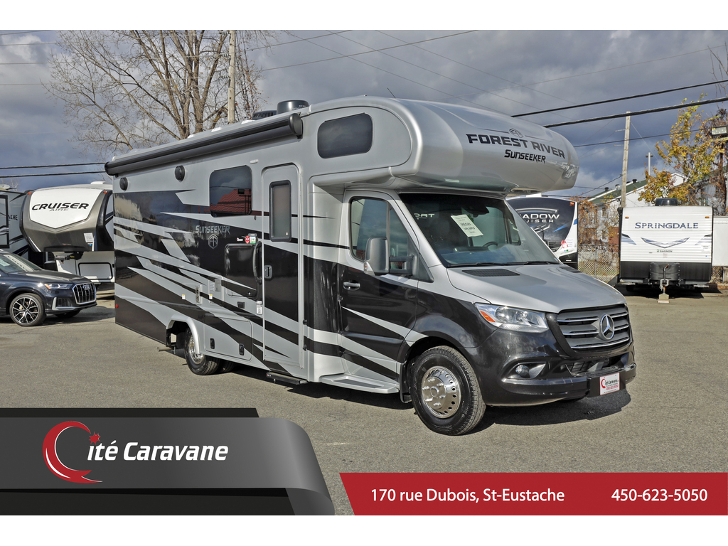 Classe C / B+ 24 pieds Mercedes Sprinter, Forest River Sunseeker MBS 2400 DSB + crics hydraulics Extérieur : Shadow grey- Tissu : Lava - Boiseries : River teak Mécanique Mercedes turbo diesel 2.0L 4cylindre bluetec ! génératrice Flex Power 4000 watts LP , air climatisée canalisé 15,000btu avec heat pump , chauffage 30,000BTU , chauffe eau 6 gallons (gas + électrique) vitres de luxe , peinture complète , capacité de remorquage de 4200lbs , sièges pivotants ,artic pack (4saisons), télévision , lit queen (60x75) , réfrigérateur 10.7 pi cube , recouvrement de plancher Beauflor , toiture en fibre de verre , marche électrique , auvent électrique , 2 batterie auxiliaires ,haut parleurs extérieur , ensemble de lumières DEL , coffres de luxe moulés , quick connect LP*PREMIUM CAMPING PACKAGE ( caméra de recul et latérales , cinéma maison 5.1 , black tank flush ,toile dextension , stores avant magnétique ) + Panneau solaire 190 watts 1654$+txs/MOIS MEILLEUR PRIX AU CANADA !! Forest River Sunseeker MBS, meilleur qualité prix 24 pieds Mercedes! www.citecaravane.com 450-623-5050, UNE ENTREPRISE FAMILIALE A VOTRE SERVICE DEPUIS 1973 !! LE SPÉCIALISTE DU VR AU QUÉBEC Venez nous voir dès aujourdhui chez Cité Caravane au 170 rue dubois à Saint-Eustache sur le bord de la 640 Classe C B+ , 24 foot Mercedes Sprinter , Forest River Sunseeker MBS 2400 DSB + hydraulic jacks Exterior : Shadow grey -Material : Lava -Wood : River teak Mercedes turbo diesel 2.0L 4 Cylinder bluetech ! 4000 watt LP generator Flex power , 15,000BTU avec heat pymp , ducted roof A/C , 30,000BTU heating system , 6 gallon water heater ( gas/propane ) , luxury frameless windows , full body paint , 4200 pound towing capacity , swivel seats , artic pack (4seasons) , televison , queen size bed (60x75) , 10.7 ft cube refrigerator , Beauflor lineolium through out , fiberglass roof , electric step , electric awning , 2 coach batteries ,exterior speakers , LED lighting , quick connect LP *PREMIUM CAMPING PACKAGE* ( back up and side cameras , surround sound system 5.1 , black tank flush , slide topper , magnetic front shades) + 190Watt solar Panel 1654$+txs/MONTH Forest River Sunseeker MBS, best value for your money!!! Mercedes-Benz ! www.citecaravane.com 450-623-5050 ! CALL US TODAY ! Cité Caravane, 170 rue Dubois in Saint-Eustache, adjacent to the 640 highway. A FAMILY OWNED BUISNESS SINCE 1973 ! QUÉBEC s RV SPECIALIST !