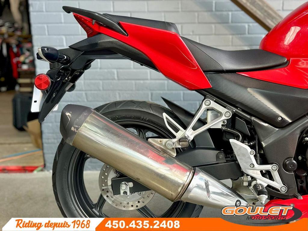 HONDA CBR 300R   \*\*\* Moto parfaite pour débuter. Facile à conduire et pas cher de plaque \*\*\*   La Honda CBR 300R 2015 est une sportive légère et polyvalente, équipée d'un moteur monocylindre 286?cc à injection électronique offrant une performance fluide et un couple constant. Son cadre léger en acier et sa suspension bien calibrée assurent maniabilité et contrôle, tandis que la position de conduite sportive reste confortable pour les trajets urbains ou routiers.   - Échappement d'origine optimisé pour un rendement moteur équilibré et une réponse fluide  - Poignées pilotes d'origine ergonomiques pour un contrôle précis et confortable  - Selle d'origine conçue pour une position de conduite optimale et un confort prolongé  - Carénage et supports d'origine assurant rigidité et protection structurelle  - Moteur 286?cc monocylindre à injection électronique pour une performance fiable et constante   ?? Cette unité est disponible chez Goulet Moto Sports Ste-Thérèse. Téléphonez au 450.435.2408   Financement disponible avec plusieurs institutions financières. 2e chance au crédit possible.   Goulet Moto Sports est votre concessionnaire moto depuis 1968. Fier représentant officiel des marques HONDA, APRILIA, MOTO GUZZI, VESPA, PIAGGIO, KTM, NIU, SURRON et URAL pour le grand Montréal. Nous avons aussi un vaste choix de motos usagées, toutes inspectées par nos professionnels. Deux adresses pour mieux vous servir : Sainte-Thérèse (450.435.2408) et Saint-Jérôme (450.431.6622).   Goulet Moto Sports ne peut être tenu responsable d'une omission, d'un délai ou d'une erreur de transcription de l'information. Le prix affiché reflète la condition de l'unité. Pour différentes raisons, les prix peuvent différer de ceux indiqués en ligne. Les données sont affichées à titre indicatif seulement et ne peuvent être considérées comme une information contractuelle. Nous vous encourageons vivement à nous consulter pour plus de détails avant de vous déplacer. Des frais tels que taxes, immatriculation, administration ou autres peuvent s'appliquer.   Se compare à : Kawasaki Ninja 300, Yamaha R3, KTM RC 390, Suzuki GSX250R, Kawasaki Z300.  Garantie: 1 mois  ----------------------  HONDA CBR 300R   \*\*\* Perfect beginner's bike. Easy to ride and inexpensive to license. \*\*\*   The 2015 Honda CBR 300R is a lightweight and versatile sports bike, powered by a 286cc single-cylinder engine with electronic fuel injection that delivers smooth performance and consistent torque. Its lightweight steel frame and well-tuned suspension ensure maneuverability and control, while the sporty riding position remains comfortable for urban or highway riding.   - Stock exhaust optimized for balanced engine performance and smooth response  - Ergonomic stock rider grips for precise and comfortable control  - Stock seat designed for an optimal riding position and extended comfort  - Stock fairing and brackets provide rigidity and structural protection  - 286cc single-cylinder engine with electronic fuel injection for reliable and consistent performance   ?? This unit is available at Goulet Moto Sports Ste-Thérèse. Call 450.435.2408   Financing available with several financial institutions. Second chance credit available.   Goulet Moto Sports has been your motorcycle dealership since 1968. We are the proud official representative of HONDA, APRILIA, MOTO GUZZI, VESPA, PIAGGIO, KTM, NIU, SURRON, and URAL brands in Greater Montreal. We also have a wide selection of used motorcycles, all inspected by our professionals. Two locations to better serve you: Sainte-Thérèse (450.435.2408) and Saint-Jérôme (450.431.6622).   Goulet Moto Sports cannot be held responsible for any omissions, delays, or transcription errors. The price displayed reflects the condition of the unit. For various reasons, prices may differ from those indicated online. The data displayed is for informational purposes only and should not be considered contractual information. We strongly encourage you to contact us for more details before traveling. Fees such as taxes, registration, administration, and other charges may apply.   Compare to: Kawasaki Ninja 300, Yamaha R3, KTM RC 390, Suzuki GSX250R, Kawasaki Z300.  Warranty: 1 mois