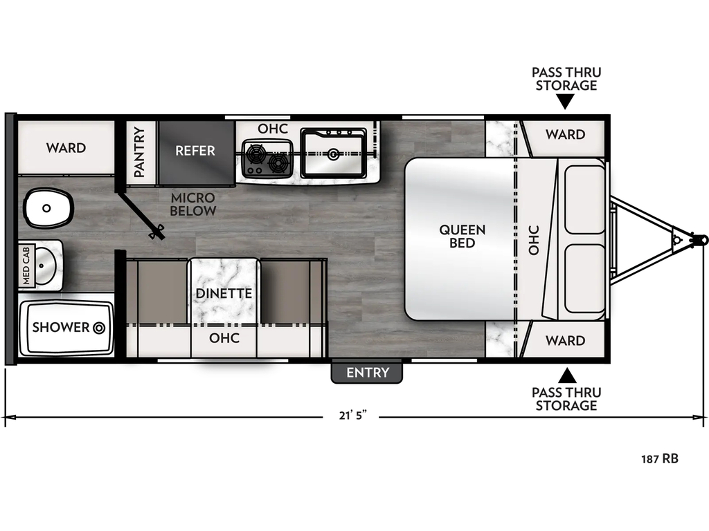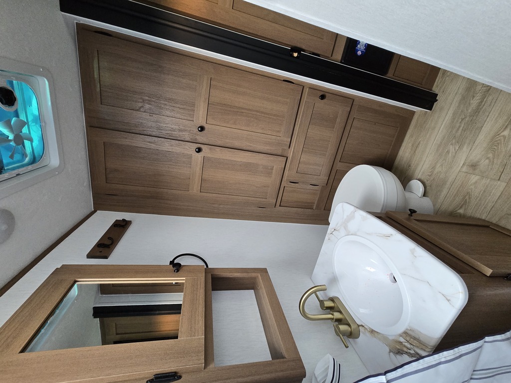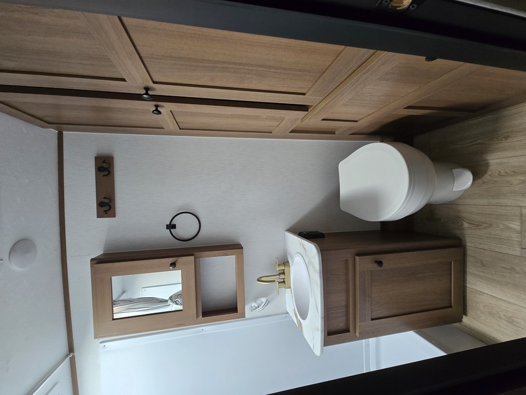 Options : Convertisseur de courant continu, Réservoir de propane, Climatiseur au plafond, Ventilateur au plafond, Vérin stabilisateur, Roue de secours, Douche extérieure, Lucarne, Douche, Toilette, Lit queen-size, Prise électrique, Détecteur LPG/CO2, Prise cable, Four à convection, Micro-onde, Auvent, Chauffe-eau à allumage direct