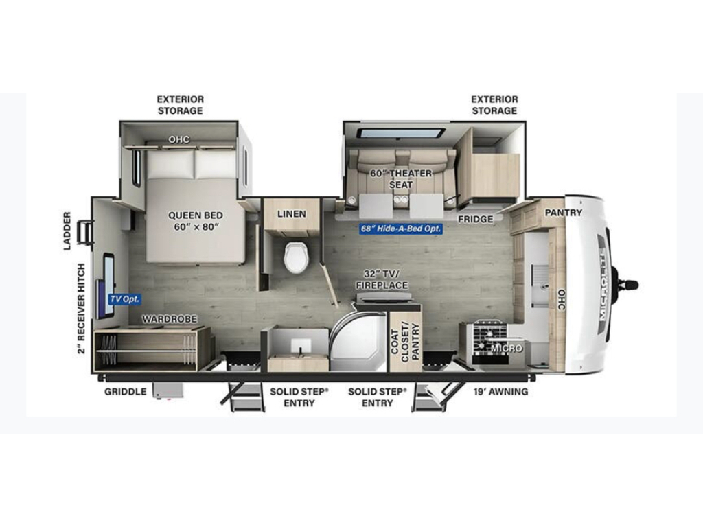 Options : Jantes aluminium, Réservoir de propane, Climatiseur conduit central, Vérin stabilisateur, Roue de secours, Douche extérieure, Échelle, Attache-remorque, Douche, Toilette, Lit queen-size, Prise électrique, Téléviseur, Antenne pour téléviseur, Micro-onde, Cuisinière, Four, Hotte, Fourneau, Auvent, Chauffe-eau