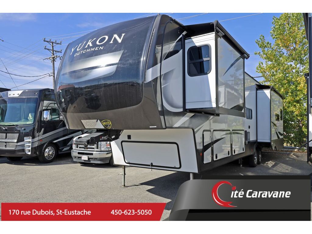 Fifth wheel Dutchmen Yukon 400RL 2022, un modèle de luxe combinant confort résidentiel et construction de qualité. D’une longueur d’environ 42.5 pieds et pesant environ 13 700 lb, cette fifth wheel vous offre le confort de la maison, sur la route. La division intérieure avec 3 extensions maximise l’espace de vie. Avec un salon arrière spacieux comprenant divan-lit, fauteuils inclinables, foyer électrique, téléviseur rétractable, vos soirées seront dans le grand confort. La cuisine centrale comprend un îlot avec évier double, un réfrigérateur résidentiel, une cuisinière et un four à gaz. La chambre principale offre un lit king, un grand garde-robe avec entrée pour laveuse-sécheuse, un foyer électrique. La salle de bain est équipée d’une grande douche style résidentiel et d’une vanité avec deux lavabos. L’équipement complet de cette fifth wheel continue avec 3 A/C au toit, fantastic fan dans la cuisine, ventilateur de plafond, système de divertissement(speaker) intérieurs et extérieurs, slide topper sur les 3 extensions, 2 auvents, stabilisateurs, réservoirs chauffants, tiroir dans le coffre de rangement extérieur et bien plus. The 2022 Dutchmen Yukon 400RL fifth wheel is a luxury model that combines residential comfort with quality construction. Approximately 42.5 feet long and weighing approximately 13,700 lbs, this fifth wheel offers the comforts of home on the road. The interior floorplan with three slide-outs maximizes living space. With a spacious rear living area featuring a sofa bed, recliners, an electric fireplace, and a retractable TV, your evenings will be spent in total comfort. The central kitchen includes an island with a double sink, a residential refrigerator, a gas stove, and an oven. The master bedroom offers a king-size bed, a large closet with a washer-dryer hookup, and an electric fireplace. The bathroom features a large residential-style shower and a vanity with two sinks. The full equipment of this fifth wheel continues with 3 A/C in the roof, fantastic fan in the kitchen, ceiling fan, entertainment system (speaker) inside and outside, slide topper on the 3 extensions, 2 awnings, stabilizers, heated tanks, drawer in the exterior storage box and much more.