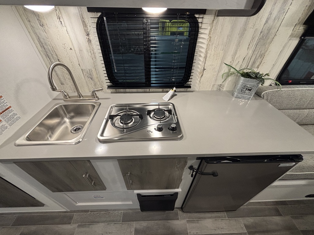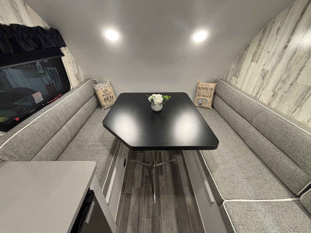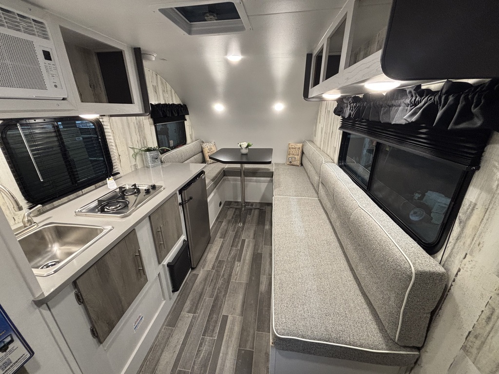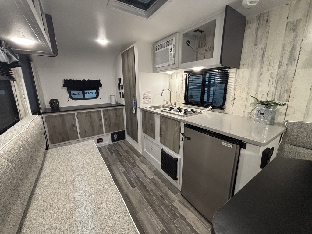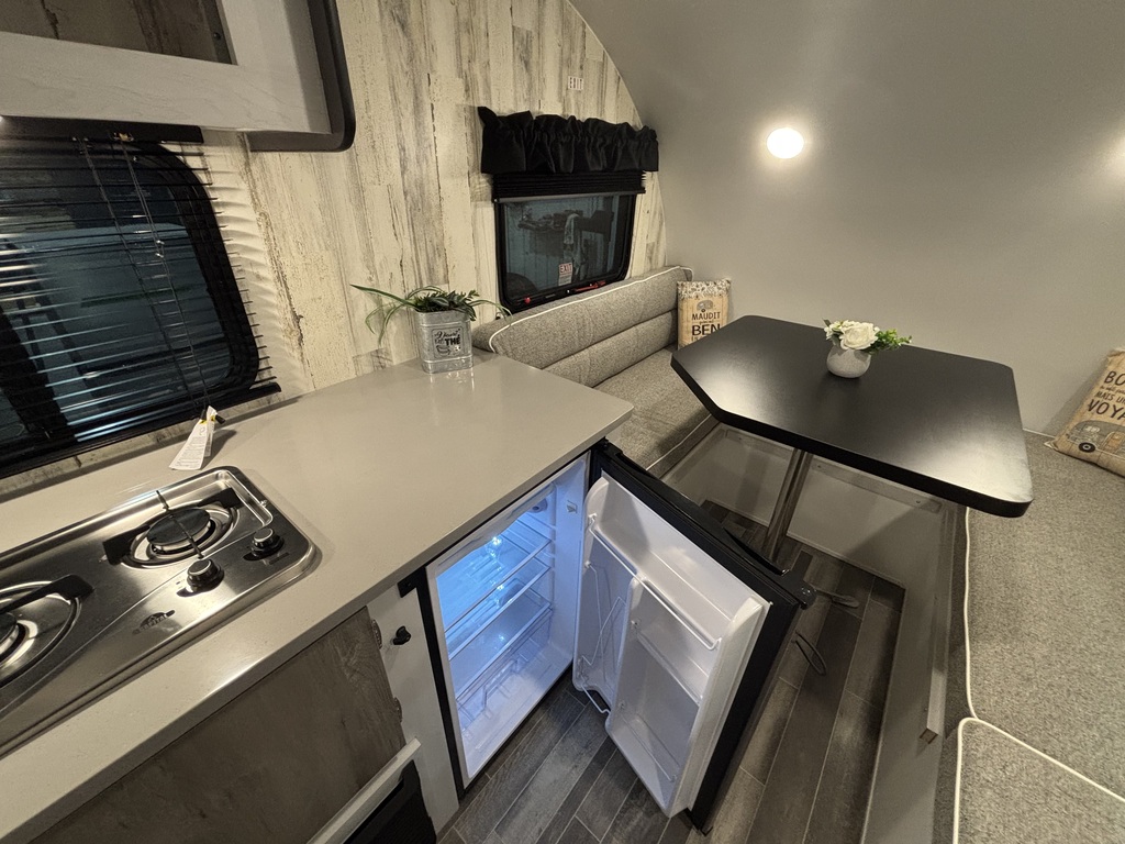 Wolf Pup 16FQW 2026! INTÉRIEUR: - Cuisine avec évier, 2 ronds de poêle, micro-ondes et grand réfrigérateur - Banquette avec belle fenestration qu...