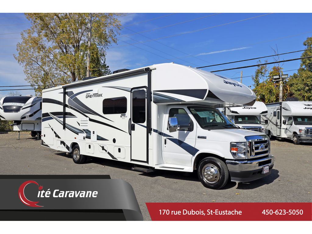 WOW motorisé Jayco Greyhawk 29MV 2022. Motorisé classe C sur châssis Ford E-450 avec moteur V8 de 7,3 L. L’équipement complet de ce vr débute par un réfrigérateur à grande capacité 4 portes, inverter, stabilisateurs hydrauliques, panneau solaire, fantastic fan dans la chambre, 2 bases pivotantes pour les sièges conducteur et passager, JRIDE sur la suspension, auvent extérieure électrique 16 pieds, slide topper sur les extensions, A/C au toit, système de chauffage au propane 31 000BTU, caméra de recul, caméras latérales, génératrice 4000W, cuisinière au propane, 2 T.V., poignées de porte de coffres deluxe, et bien plus ! Ce modèle se démarque par sa grande luminosité et sa spacieuse aire de vie maximisée par deux 2 extensions, qui vous feront sentir à la maison tout en étant sur la route ! www.citecaravane.com 450-623-5050 RUE DUBOIS ,ST-EUSTACHE, SUR LE BORD DE LA 640! UNE ENTREPRISE FAMILIALE A VOTRE SERVICE DEPUIS 1973 ---------------------------------------------------------------------------------------------------------------------------------------------- WOW Jayco Greyhawk 29MV 2022. Class C motorhome on Ford E-450 chassis with 7.3L V8 engine. The complete equipment of this RV starts with a large capacity 4-door refrigerator, inverter, hydraulic stabilizers, solar panel, fantastic fan in the bedroom, 2 swivel seats for the driver and passenger side, JRIDE on the suspension, 16-foot electric exterior awning, slide topper on the slide-outs, A/C on the roof, 31,000BTU propane heating system, backup camera, side cameras, 4000W generator, propane stove, 2 TVs, deluxe trunk door handles, and much more! This model stands out for its great brightness and its spacious living area maximized by two 2 slide-outs, which will make you feel at home while being on the road! www.citecaravane.com 450-623-5050 RUE DUBOIS, ST-EUSTACHE, ON THE EDGE OF THE 640! A FAMILY BUSINESS AT YOUR SERVICE SINCE 1973