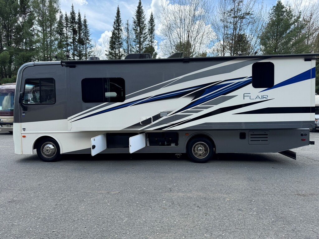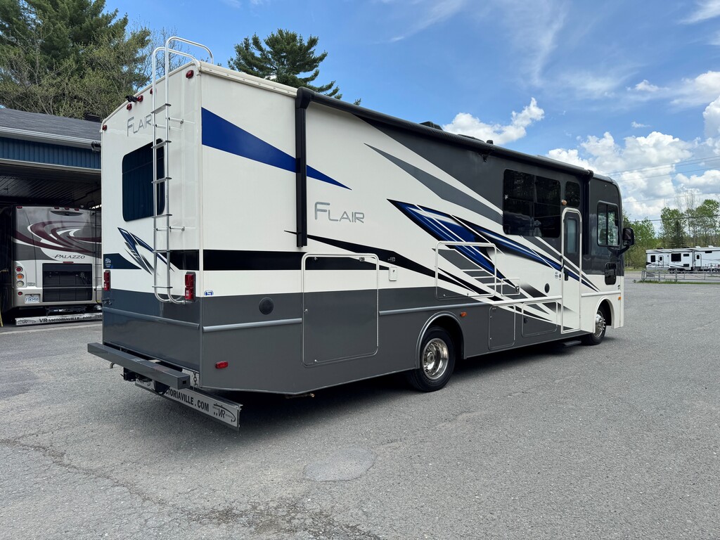 Fleetwood Flair 29M 2021, Mécanique Ford V8 7.3L, Cuisinette extérieur, Grande cuisine intérieur complète avec poêle et four au propane Dometic, Beaucoup de rangements, Réfrigérateur électrique résidentiel, Onduleur de 1000W, Panneau solaire 300W avec controleur de charge, Chambre arrière avec lit king, Lit avant rabbatable, Auvent électrique, Système caméras à angles morts, Téléviseur extérieur avec système audio, Système de son intérieur bluetooth, Jack stabilisateur hydraulique avec commande électronique automatique et beaucoup plus. Une visite vous convaincra! Année : 2021 Mécanique : Ford V8 7.3L Châssis : Ford F53 Carburant : Essence Transmission : TorqShift 6 vitesses automatique Motricité : 4X2 Longueur hors-tout(pieds) : 31 Largeur(pieds) : 8.3 Hauteur(pieds) : 12.3 Empattement(pouces) : 190 PNBV(Lbs) : 18,000 Réservoir essence(Gal.) : 80 Capacité eau fraîche(Gal.) : 50 Capacité eau grise(Gal.) : 37 Capacité eau noir(Gal.) : 37 Capacité réservoir propane(Lbs) : 59 Nombre d’extensions : 1 Capacité d’hébergement : 8 Pneus : 245/70R 19.5G Air conditionné(BTU) : 15,000 Chauffage(BTU) : 30,000 Consulter la brochure du manufacturier en cliquant ici
