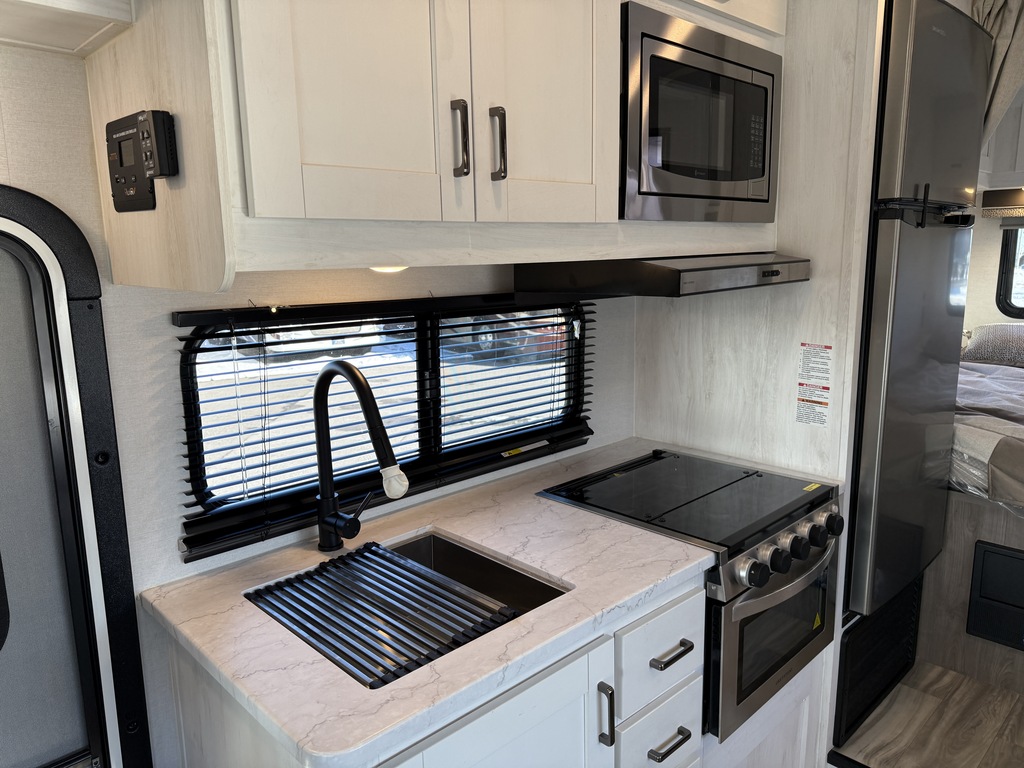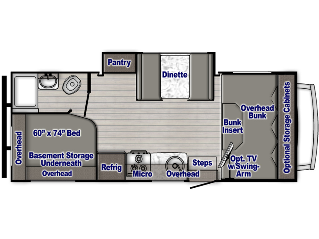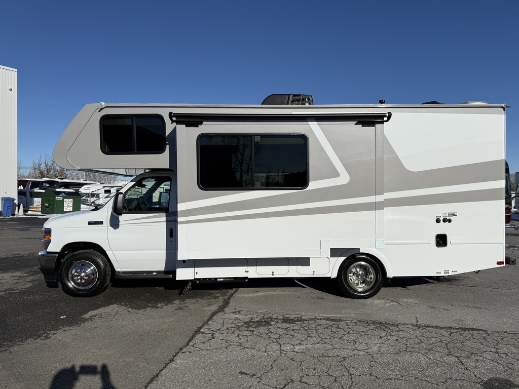 Options : Jantes aluminium, Génératrice à essence, Convertisseur de courant continu, Réservoir de propane, Climatiseur au plafond, Climatiseur au tableau de bord, Climatiseur conduit central, Vitres électriques, Miroirs électriques, Régulateur de vitesse, Volant inclinable, Caméra Marche arrière, Cric hydraulique, Roue de secours, Douche extérieure, Attache-remorque, Toilette, Lit queen-size, Prise électrique, Détecteur LPG/CO2, Micro-onde, Cuisinière, Four, Hotte, Fourneau, Auvent, Chauffe-eau
