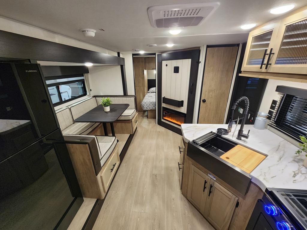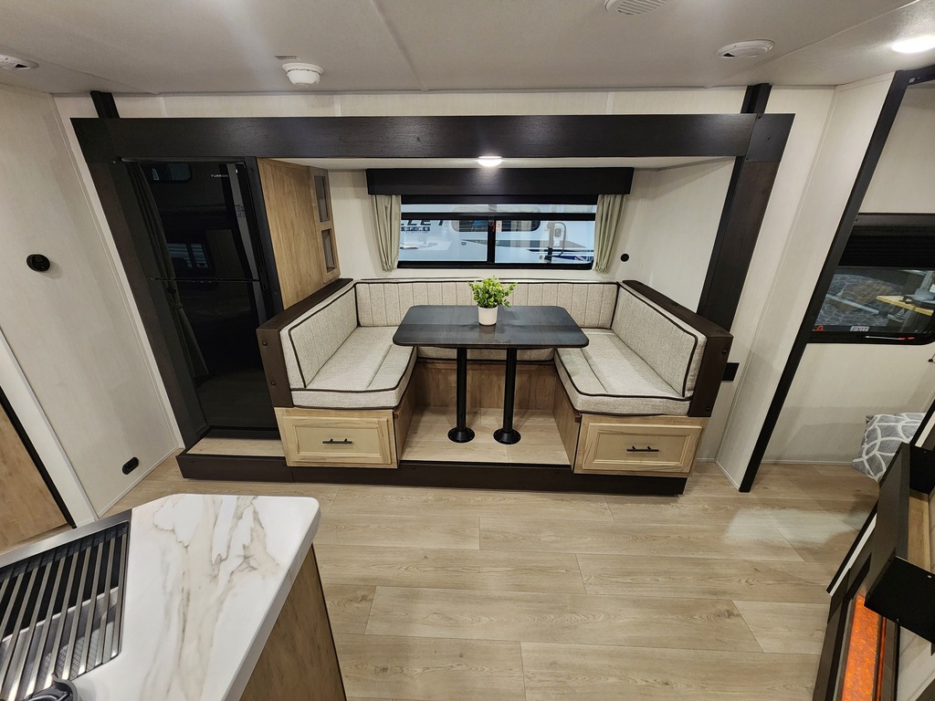 Wolf Pup 16FQW 2026! INTÉRIEUR: - Cuisine avec évier, 2 ronds de poêle, micro-ondes et grand réfrigérateur - Banquette avec belle fenestration qu...