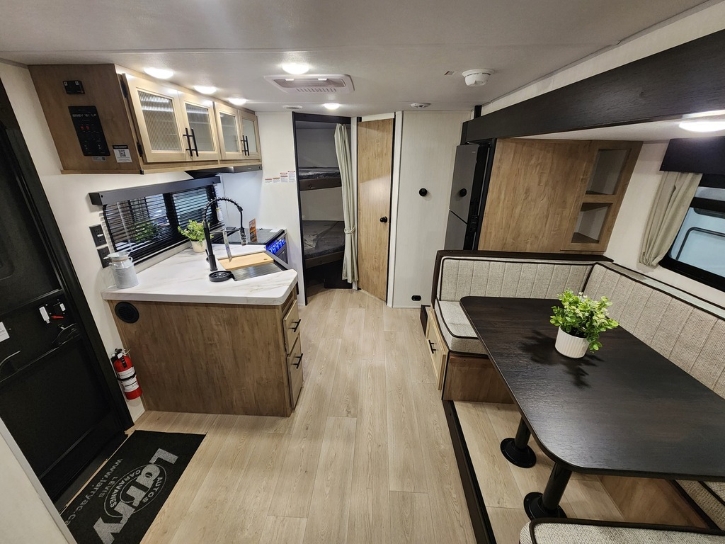 NOUVEAU MODÈLE ARRIVÉ!!!! À VOIR ABSOLUMENT!!! GREY WOLF 23MS 2026. Parfaite pour une famille! Peut coucher jusqu'à 8 personne. Elle pèse 5700 lbs. INTÉRIEUR: - Cuisine entièrement équipée avec grand réfrigérateur - Dinette en U se transformant en lit supplémentaire - Garde-robe à l'entrée - Foyer avec rangement caché derrière - Chambre des maîtres fermée avec porte coulissante - Bac de rangement sous le lits superposés doubles - Salle de bain complète - Beaucoup de rangement dans les armoires EXTÉRIEUR: - Auvent électrique avec lumières LED - Cuisinette extérieure - Haut-parleurs extérieurs - Marches solides - Coffres de rangement - Vérin avant et stabilisateurs électriques *Photos à titre indicatif*