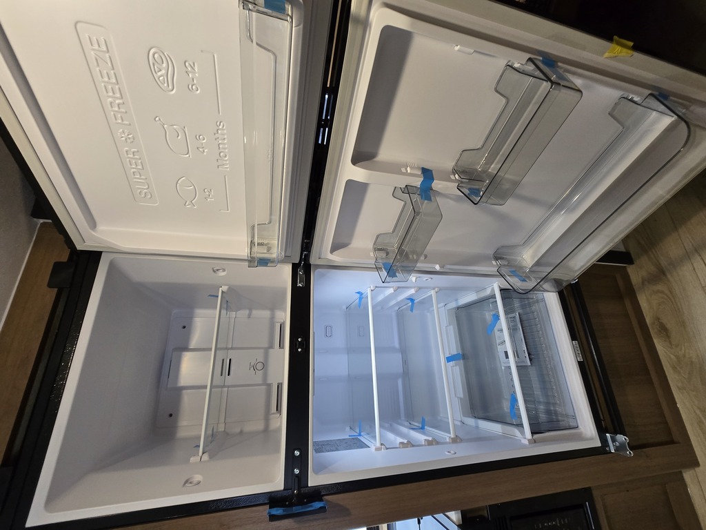 Options : Convertisseur de courant continu, Réservoir de propane, Climatiseur au plafond, Ventilateur au plafond, Vérin stabilisateur, Roue de secours, Douche extérieure, Douche, Toilette, Lit queen-size, Lits superposés, Prise électrique, Prise cable, Micro-onde, Auvent, Chauffe-eau à allumage direct
