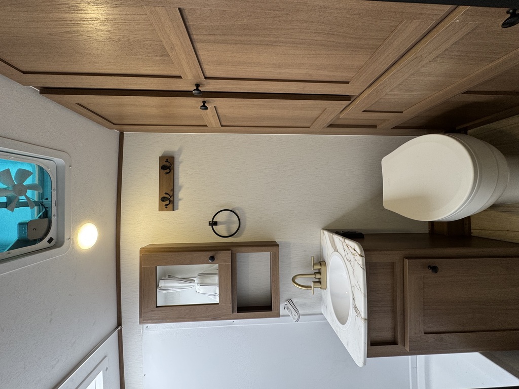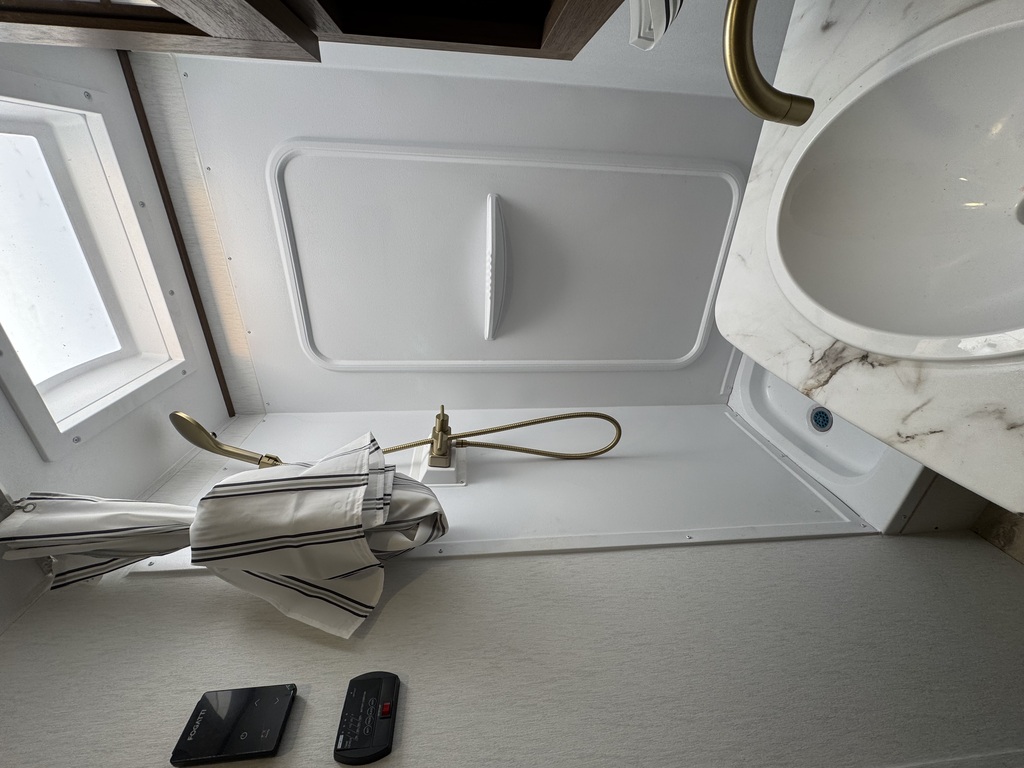 Options : Convertisseur de courant continu, Réservoir de propane, Climatiseur au plafond, Ventilateur au plafond, Vérin stabilisateur, Roue de secours, Douche extérieure, Douche, Toilette, Lit queen-size, Prise électrique, Détecteur LPG/CO2, Prise cable, Micro-onde, Auvent, Chauffe-eau à allumage direct