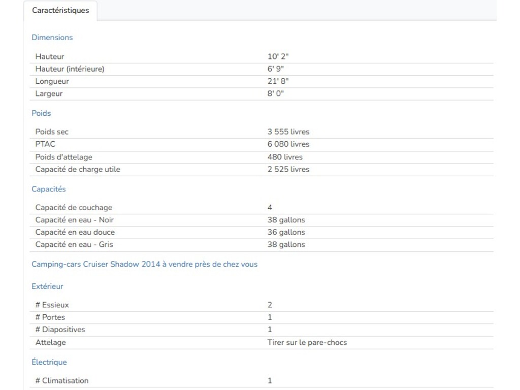 Paiement à partir de $/sem. + TX. 2014 Cruiser RV Shadow Cruiser 195RBS Magnifique roulotte de voyage de 19 pieds - 3 586 lb - capacité de couchage de 4 personnes (lit queen et canapé-lit) - Réfrigérateur propane/électrique - Auvent électrique - 1 extension pour plus d'espace de vie - VR vendu dans notre section bricoleur: Infiltration d'eau à l'avant, tous les appareils fonctionnent, bon état des pneus! Vendu sans garantie. Contactez nos conseillers par téléphone, courriel ou texto ! Nous acceptons les échanges de tout genre et on s'occupe de votre financement sur place ! VR Thetford est votre spécialiste en véhicules récréatifs et de loisirs (VR, motorisés, roulottes, fifth wheel, remorques, VTT, côte-à -côte et motoneiges). Notre équipe saura vous guider dans votre choix de véhicules et d accessoires. Nous sommes concessionnaire Jayco, Passport, Flagstaff, Compass, Magnitude, Outlaw, Alcom, Remjco, Laroche, Talaria et Polaris ! Au plaisir de vous servir ! *Photos à titre indicatif. Certains accessoires et équipements pourraient être en sus* *Prix sujet à changement sans préavis, valider le prix auprès d'un conseiller*