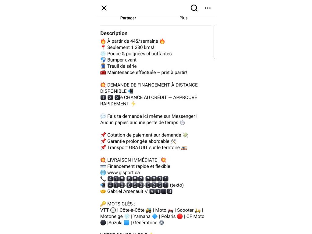 Seulement 5000 KM Inspection et maintenance complétées Très bien équipé - Bumper avant et arrière - Treuil puissant - Coffre arrière spacieux - Bons pneus, pret à tout Demande d'approbation rapide 1-2-3e chance au crédit Cotation de paiements disponible Prix ajusté selon votre dossier de crédit Grantis prolongée dispo à petit prix Livraison GRATUITE partout sur le territoire Pret à partie MAINTENANT Tell : 418-887-3691 Texto : 418-858-0251 Gabriel Arsenault pose 418