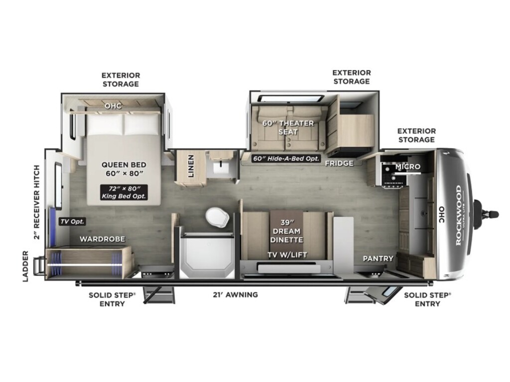 Rockwood Ultra Lite 2619FK 2026Roulotte Rockwood 2619FK 2026 Mesure 29'8 et pèse 6 813lbs Réservoir d'eau fraîche: 54 GAL Réservoir d'eaux usés: 135 GAL. Magnifique cuisine avant avec banquette Canapé théâtre Salle de bain centrale Chambre des maîtres avec grand lit et garde-robe pour rangement Porte principale au niveau de la cuisine et porte secondaire dans la chambre. Auvent rétractable électrique Construction complète de murs composites Toiture piétonne entièrement laminée Cadre entièrement en aluminium à 6 côtés Contreventement de toit en fermes d'aluminium Plancher en contreplaqué à rainure et languette de 5/8 po Poutrelles de plancher en aluminium Coin repas, lit et couchette en aluminium Capuchon avant en fibre de verre peint avec couche transparente Pare-brise en verre automobile *** Prendre note que les photos et les options décrites peuvent différées *** Toute l'équipe de Centre du VR est fière de vous présenter le plus vaste inventaire de véhicules récréatifs neufs et d'occasions à vendre au Québec. Vous y trouverez notamment les marques Columbus, Rockwood, Impression, Kodiak, Coleman, Cruiser RV, Flagstaff, E-Pro, Springdale, Sunset Trail, Cougar, Chaparral, Bontrager Outdoors, motorisés Axis, Hurricane, Outlaw, Coachmen Cross Trail, Prism, Echelon, Fleetwood, Four winds, Compass, Beyond, Nova et Pixel. Remorques N&N, Apogée et Armorteck sont aussi disponibles. En inventaire pour vous, la série de génératrices Ducar. Vous avez un coup de coeur ? Envoyez-nous une demande d'information. Financement sur place. N'oubliez pas également que rien ne vaut une visite du modèle qui vous intéresse pour vous aider à prendre une décision éclairée. Passez donc nous voir afin de jeter un coup d'oeil plus détaillé à nos caravanes et caravanes à sellettes neuves.