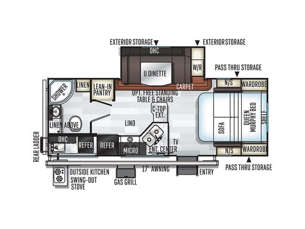 Options : Climatiseur au plafond, Douche, Toilette, Lit double, Détecteur LPG/CO2, Téléviseur, Prise cable, Micro-onde, Cuisinière, Four, Hotte, Fourneau, Auvent