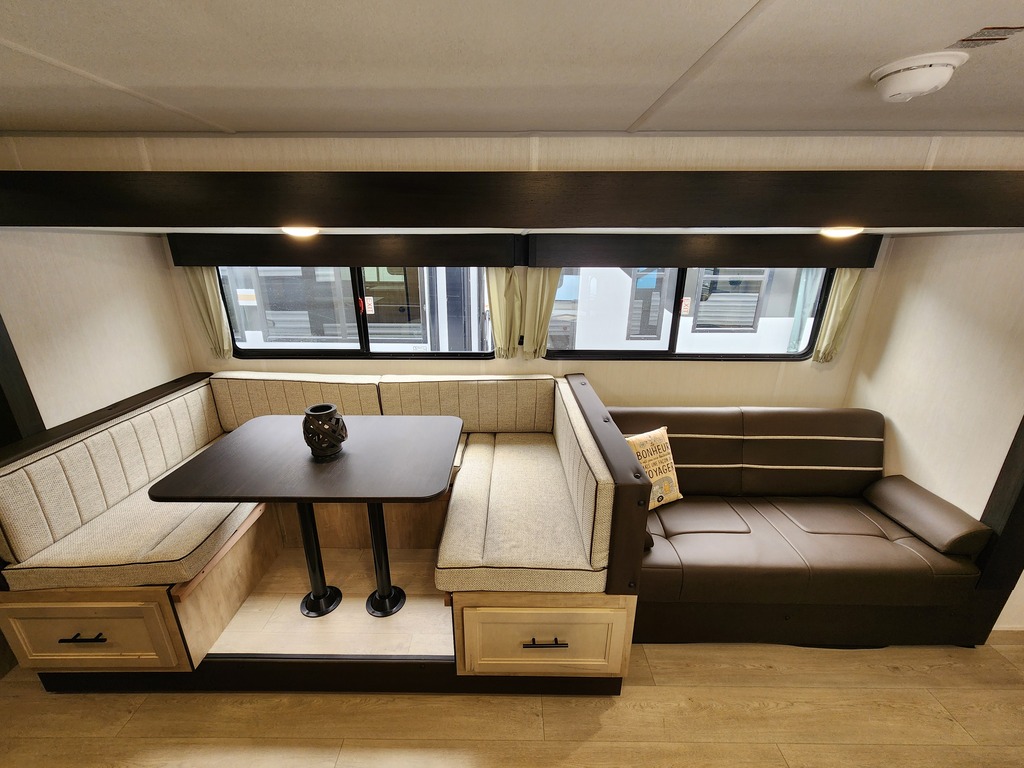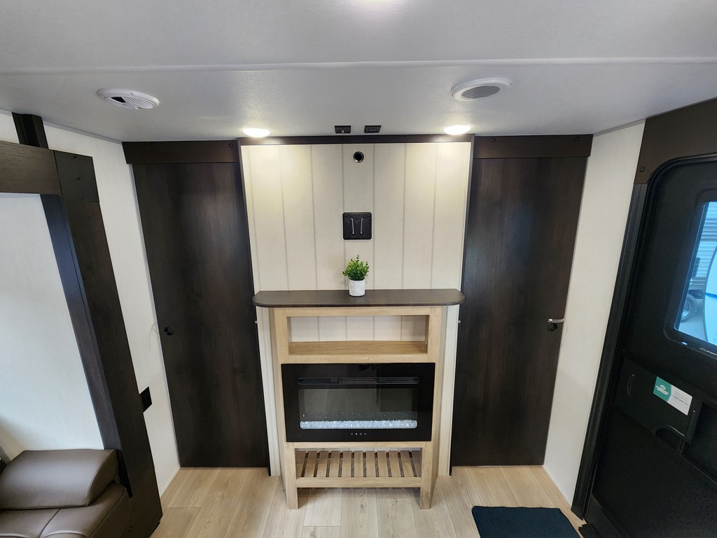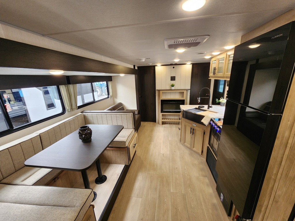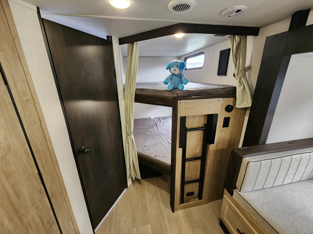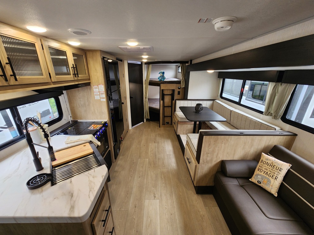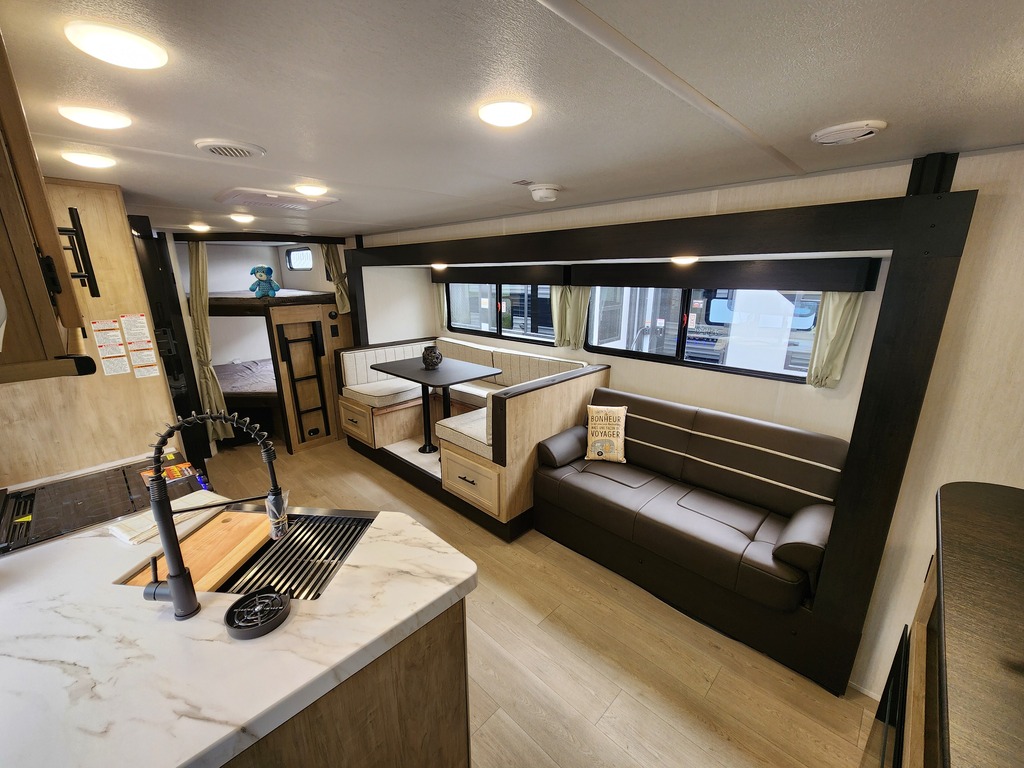 VENDU !!! Grey Wolf 26DBH 2026 Roulotte idéale pour la famille. Elle est complètement équipée avec un poids de seulement 6500 lbs. Elle a une extension double avec sofa lit et banquette en "U". Pour une plus grande intimité, la chambre avant a de vraies portes et à l'arrière il y a des lits superposés double avec une échelle pour faciliter l'accès. Très pratique, la grande salle de bain a une porte donnant sur l'extérieur. La cuisine a beaucoup de commodité tel qu'un grand évier, 3 ronds de poêle, un réfrigérateur, micro-ondes convection et air fryer ainsi qu'un grand garde-manger. Cette roulotte est parfaite pour passer du bon temps à l'extérieur grâce à l'auvent électrique et à la petite cuisine extérieure. Le support arrière peut être pratique pour le transport des vélos ou autres articles (jeux pour les enfants, bois pour les feux). Cette roulotte a une très belle finition intérieure avec dosseret de cuisine et foyer électrique. Elle est la plus vendue de sa catégorie. Financement facile sur place. photos à titre indicatif