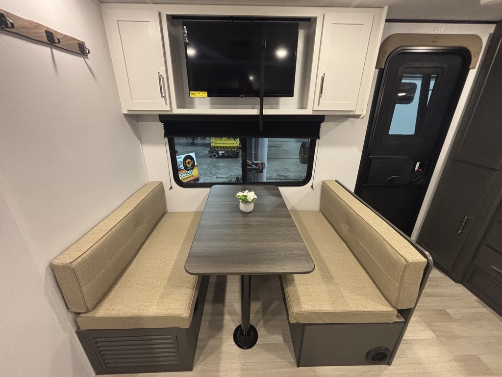 Wolf Pup 16FQW 2026! INTÉRIEUR: - Cuisine avec évier, 2 ronds de poêle, micro-ondes et grand réfrigérateur - Banquette avec belle fenestration qu...