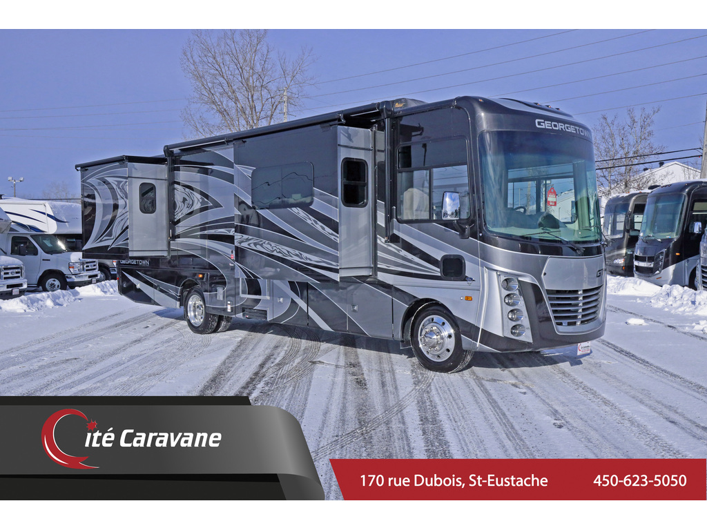 2022 Forest River Georgetown GT7 Modèle 32J7 Ce véhicule récréatif mesure environ 35 pieds de long et comprend des sièges de théâtre, 3 chambres coulissantes, un lit king-size, 2 A / C et un réfrigérateur résidentiel. Ce magnifique nouveau camping-car comprend également le nouveau châssis Ford avec 7,3 L PFI V-8, 350 CV, 468 lb-pi. moteur couple, une transmission automatique TorqShift® à 6 vitesses, un combiné d'instruments mis à jour, des phares automatiques et un volant inclinable / télescopique. L'équipement en option comprend la magnifique peinture corporelle complète, les fenêtres à double vitrage, entrée pour laveuse / sécheuse empilables. Le Forest River Georgetown comprend également des roues en aluminium, un générateur 7KW, un onduleur 2000w, des réservoirs de rétention chauffés, une fenêtre pour chien dans le cockpit, un loft électrique P2K, une grande télévision LED de salon, des sièges de cinéma électriques, une télévision LED de chambre à coucher, des comptoirs en surface solide, un micro-ondes à convection, Panneau de système multiplex, système de nivellement hydraulique et bien plus encore! www.citecaravane.com 450-623-5050 170 rue dubois, St-eustache J7P 4W9 2022 Forest River Georgetown GT7 Model 32J7 This RV is approximately 35 feet in length featuring theater seating, 3 slide-out rooms, king bed, 2 A/Cs and a residential refrigerator. This beautiful new motorhome also features the new Ford chassis with 7.3L PFI V-8, 350HP, 468 ft. lbs. torque engine, a 6-speed TorqShift® automatic transmission, an updated instrument cluster, automatic headlights and a tilt/telescoping steering wheel. Optional equipment includes the beautiful full body paint, dual pane windows, stackable washer/dryer preperation. The Forest River Georgetown also features aluminum wheels, 7KW generator, 2000w inverter, heated holding tanks, doggy window in cockpit, P2K power overhead loft, large LED living room TV, power theater seats, bedroom LED TV, solid surface countertops, convection microwave, Multiplex system panel, hydraulic leveling system and much more ! www.citecaravane.com 450-623-5050 170 rue dubois , St-eustache J7P 4W9