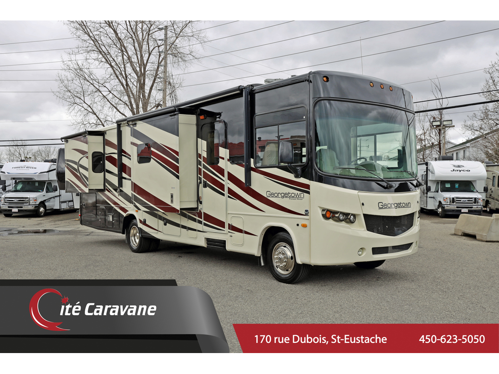 Forest River Georgetown 328TS est un motorisé de classe A à essence, mesurant environ 34,3 pieds et bâti sur un châssis Ford F-53 avec un moteur Triton V10 de 6,8L (362ch). Il dispose de trois extensions (slides), incluant un coin salon/cuisine spacieux, un lit Queen, et une capacité de couchage pouvant accueillir jusqu'à 6 personnes. Caractéristiques principales du Georgetown 328 2015 : • Motorisation : Moteur Triton V10 6.8L, 362 HP, essence. • Dimensions : Longueur de 34' 4" (\(10.5\) m), hauteur intérieure de 80" (\(2032\) mm). • Aménagement : Trois extensions (3-slides), souvent avec lit Queen dans la chambre, canapé-lit et coin repas. • Capacités : Eau fraîche : 50 gal (\(189\) L), Eaux grises : 41 gal (\(155\) L), Eaux noires : 41 gal (\(155\) L), Propane : 29 gal (\(123\) lbs). • Équipements : Vérins de mise à niveau hydrauliques (4 points), génératrice 5500 W, deux unités d'air climatisé , téléviseur, caméra de recul • Cuisine : Réfrigérateur de type résidentiel , cuisinière 3 brûleurs, four, micro-ondes. Ce modèle est apprécié pour son espace de vie ouvert et ses nombreux rangements, adaptés aux longs séjours. • Possibilité de payer 1 seul taxe si l’acheteur ne nécessite pas de financement www.citecaravane.com 450-623-5050 170 rue dubois , St-eustache J7P 4W9