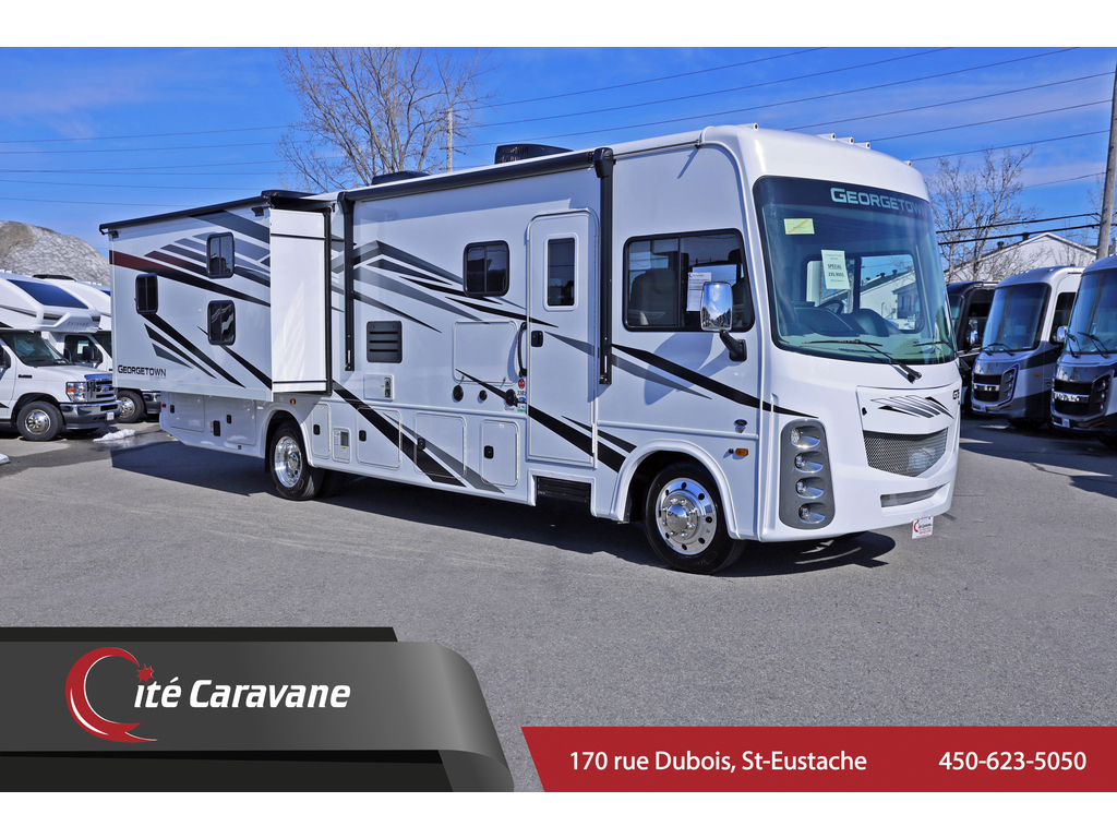 Disponible sur commande - available on order Forest River Georgetown GT3 33B3 Classe A avec l'intérieur Granite. Son équipement complet débute par 2 extensions , caméras latérales et arrière, artic pack (4 saisons), toît une pièce en fibre de verre, murs extérieurs 2¨ avec finition Gel Coat et fabrication de type Vacuum Bonded, portes de coffres avec pentures latérales, black tank flush (système de nettoyage de la fosse deaux noires), éclairage dans les coffres extérieurs, alimentation électrique 50 ampères, auvent principale électrique, auvents protecteurs au-dessus des extensions, stabilisateurs hydrauliques automatiques, génératrice , A/C au toît, attache remorque 5000 lbs, revêtement de plancher de qualité supérieure (Beauflor), chauffe-eau 6 gal, antenne automatique, fantastic fan, lit king, 2 T.V., lit au-dessus des sièges conducteur et passager, lecteur AM/FM/DVD/Bluetooth & USB intégré!!! Contactez-nous pour profiter du MEILLEUR PRIX AU QUÉBEC, www.citecaravane.com 877-500-5394 170 Rue Dubois, St-Eustache J7P 4W9-------------------------------------------------------------------------------------------------------------------Forest River Georgetown GT3 33B3 Class A with Granite interior. Its complete equipment starts with 2 slide out , back up + side cameras, artic pack (4 seasons), fiberglass roof, 2¨exterior walls with Gel Coat finish and Vacuum Bonded type construction, Lots of starage , black tank flush, exterior storage lighting, 50 amp power supply, electric awning, slide topper, automatic hydraulic stabilizers, generator,roof A/C , 5000 lbs trailer hitch, high quality floor covering (Beauflor), 6 gal water heater, automatic antenna, fantastic fan, king bed, 2 TV, bed driver and passenger seats, AM / FM / DVD / Bluetooth player & USB built-in !!! Contact us to take advantage of the BEST PRICE IN QUEBEC, www.citecaravane.com 877-500-5394 170 Rue Dubois, St-Eustache J7P 4W9