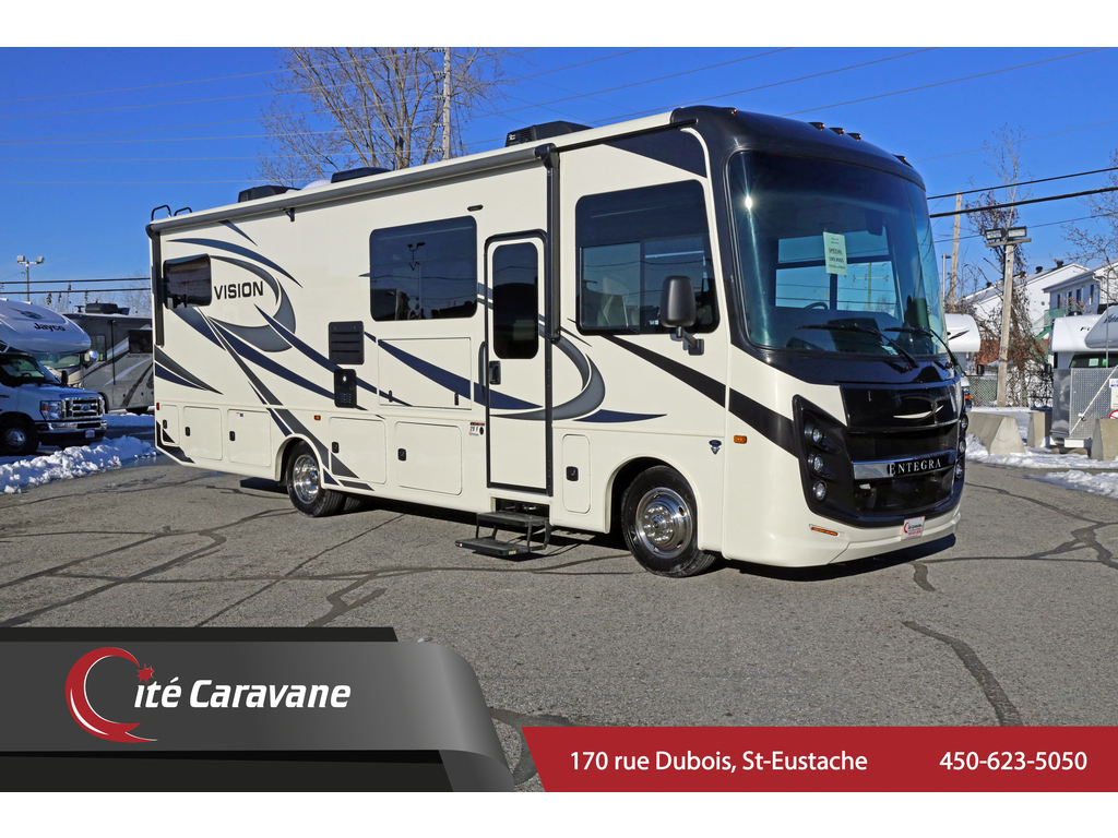 *Disponible sur commande - Available on order Entegra Coach Vision 29F + frigidaire 4 portes + bunk beds + panneau solaire VR de luxe à vendre à Cité caravane. Ce magnifique véhicule récréatif comprend 1 extension a mur plein, un aménagement spacieux et confortable, des vérins de nivellement hydrauliques automatiques, un châssis Ford F53 et un moteur Triton V-8 7.3L L. Cet incroyable VR comprend des caméras arrière et de vision latérale avec moniteur, un store électrique avec lumières DEL, un centre de divertissement extérieur avec TV et DVD / radio, un système d'info divertissement, un téléviseur LED dans le salon, un toit en fibre de verre et les toiles de recouvrement dextensions. une télévision. La liste impressionnante des caractéristiques standard de la Vision qui la distinguent de la concurrence comprend la garantie inégalée de 2 ans d'Entegra, des compartiments verrouillables , des couvert avant et arrière en fibre de verre monobloc, un pare-brise panoramique , un siège conducteur à 6 directions, micro-ondes à convection inoxydable, toit en fibre de verre , convertisseur de 1000 watts, guides à tiroir à roulement à billes, grande douche et 2 A/C au toit bien plus encore! www.citecaravane.com 877-500-5394 170 Rue dubois St-eustache! Le plus grand inventaire de VR au Canada! Entegra Coach Vision 29F + 4 door fridge + bunk beds + solar panel Class A Luxury RV for sale at Cité caravane This beautiful RV features 1 full wall slide-out, a comfortable, spacious layout, automatic hydraulic leveling jacks, Ford F53 chassis and a 7.3L V8 This amazing RV boasts Customer Value Package which features backup & side-view cameras with monitor, electric awning with LED lights, exterior entertainment center with TV & DVD/radio, infotainment system, LED TV in living room, roller shades, seamless crowned fiberglass roof and slide-out cover awnings. Optional equipment includes a front overhead bunk . The Vision's impressive list of standard features that truly set it apart from the competition include Entegra's unparalleled 2 year warranty, lockable slam latch storage compartments, one-piece fiberglass front and rear caps, panoramic windshield with power shade, 6-way power driver's seat, stainless convection microwave, seamless crowned fiberglass roof, 1000 watt inverter, ball-bearing drawer guides,, large shower and 2 roof A/C much more ! www.citecaravane.com 877-500-5394 170 Rue dubois St-eustache ! Canadas biggest RV inventory **photo a tire indicatif ** not actual pictures of incoming unit *