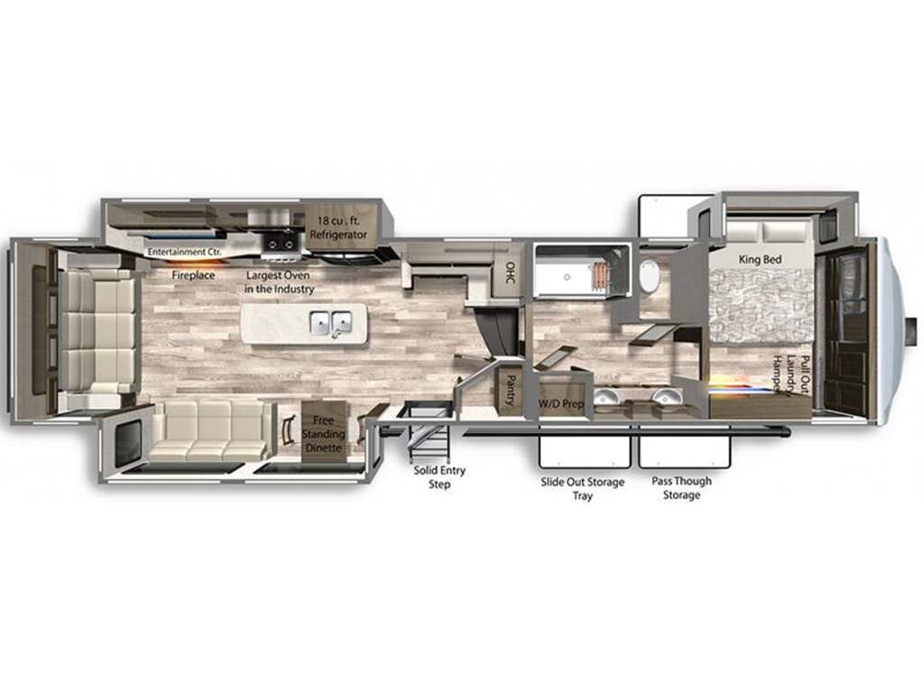 Options : Réservoir de propane, Climatiseur conduit central, Ventilateur au plafond, Vérin stabilisateur, Roue de secours, Douche extérieure, Échelle, Attache-remorque, Douche, Toilette, Canapé-lit, Prise électrique, Cric électrique, Téléviseur, Antenne pour téléviseur, Micro-onde, Four, Fourneau, Auvent, Chauffe-eau